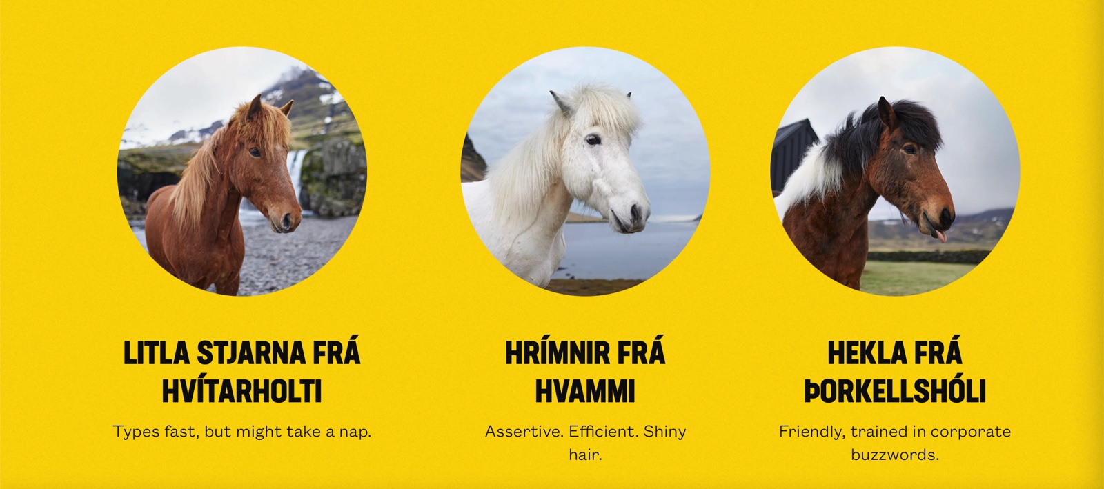 Có 3 chú ngựa xinh đẹp khoẻ khoắn để du khách lựa chọn. Đó là Litla Stjarna Frá Hvítarholti, một chú ngựa nâu có bờm vàng được mô tả là một rất nhanh nhẹn nhưng cực kỳ mê ngủ; Hrímnir Frá Hammy, một chiến mã đầy “quyết đoán” và “hiệu quả” với bộ lông óng ả; và Hekla Frá Þorkellshóli, một em ngựa thân thiện “đã được đào tạo qua về văn hoá công ty”.