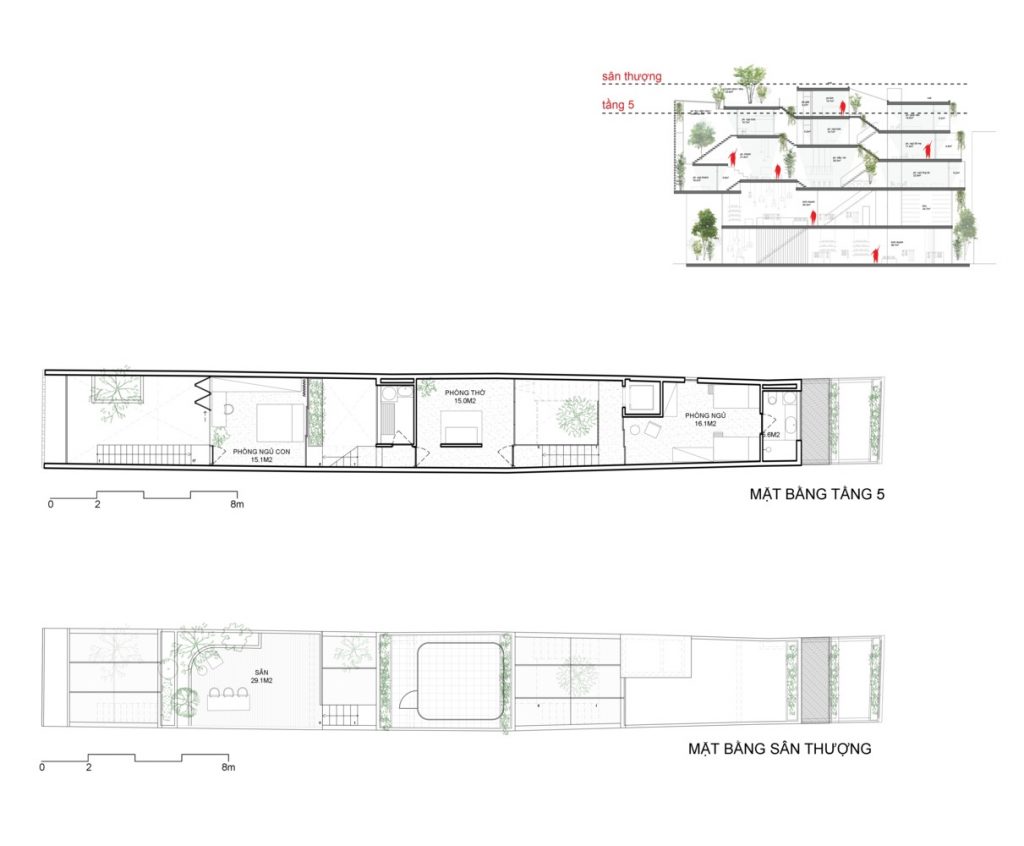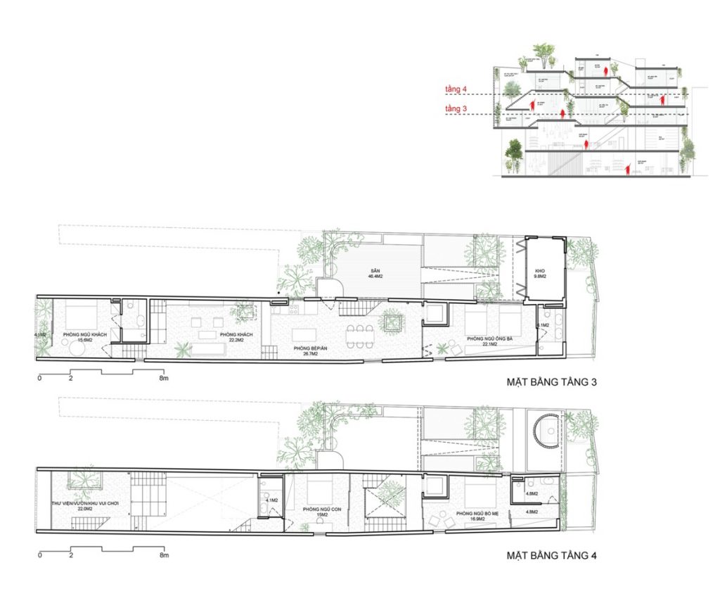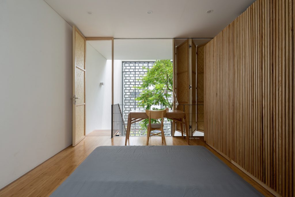 Ngoài ra, phòng ngủ của hai con nằm phía trên khu vực chung chính, bên cạnh các khoảng trống, cho phép kết nối với các thành viên trong gia đình ở tầng dưới. Khu vực yên tĩnh nằm ở trong cùng của ngôi nhà, bao gồm phòng ngủ của ông bà và phòng ngủ chính của bố mẹ. Yếu tố quan trọng của không gian nội thất là ba khoảng trống ngăn cách thể tích ngôi nhà để cung cấp ánh sáng tự nhiên vào các không gian tầng thấp hơn của ngôi nhà.