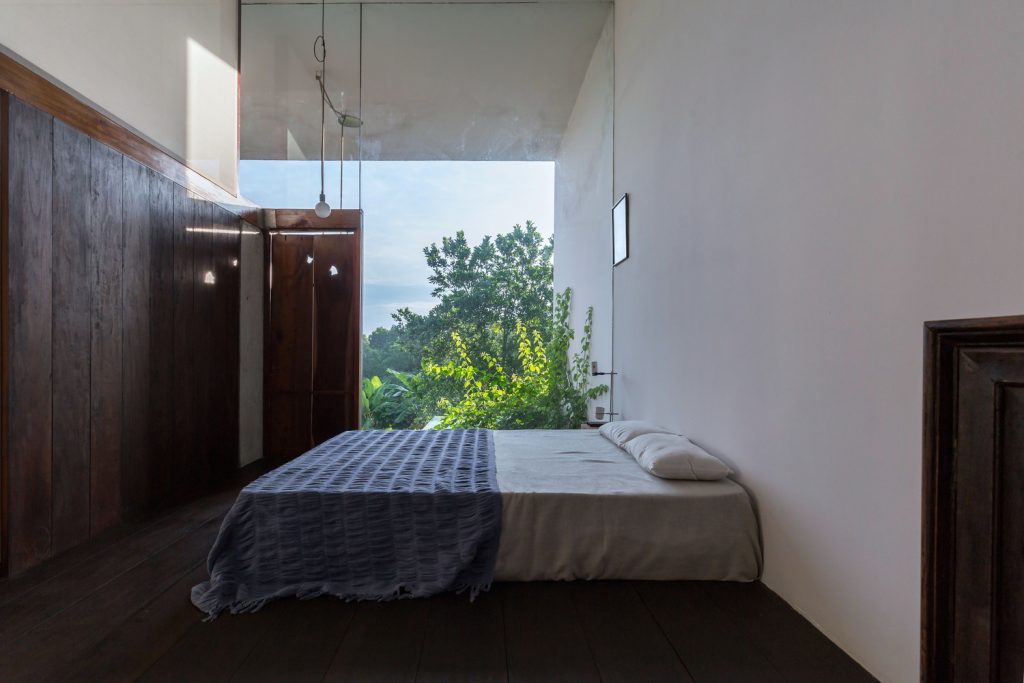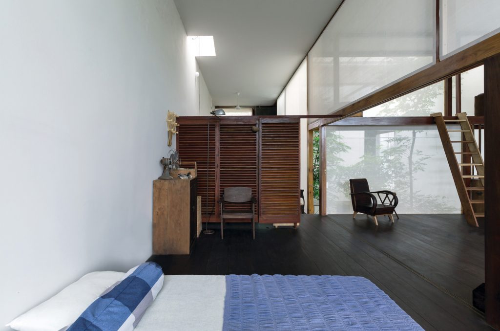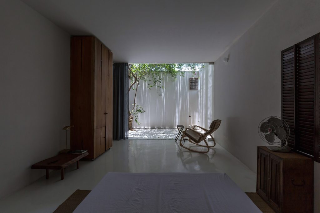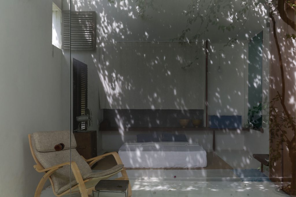 Với suy nghĩ đó, nhóm KTS đã xây dựng ngôi nhà như một chiếc vỏ bê tông rỗng với đủ diện tích sử dụng. Nửa còn lại của ngôi nhà (phần lõi) được xây dựng bằng vật liệu địa phương, phát triển trên cấu trúc bằng gỗ và lưới. Hệ thống khung cốt lõi được thiết kế cho kế hoạch 5 năm tới. Khi bước sang giai đoạn 2, hệ thống lưới sẽ được thay thế bằng modul vách gỗ để đảm bảo sự riêng tư cho không gian phòng ngủ tầng 2 mà không làm ảnh hưởng đến sinh hoạt của gia đình trong quá trình thi công. Nội thất sẽ được hoàn thiện với một số vật dụng cũ và gỗ thừa từ quá trình xây dựng.