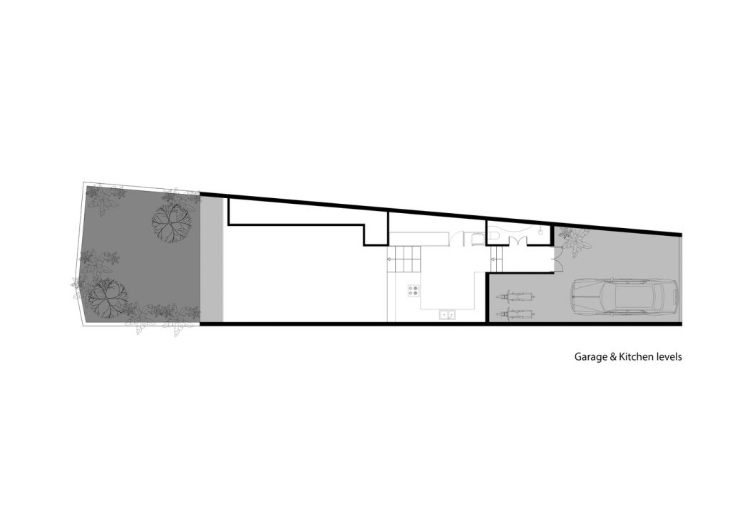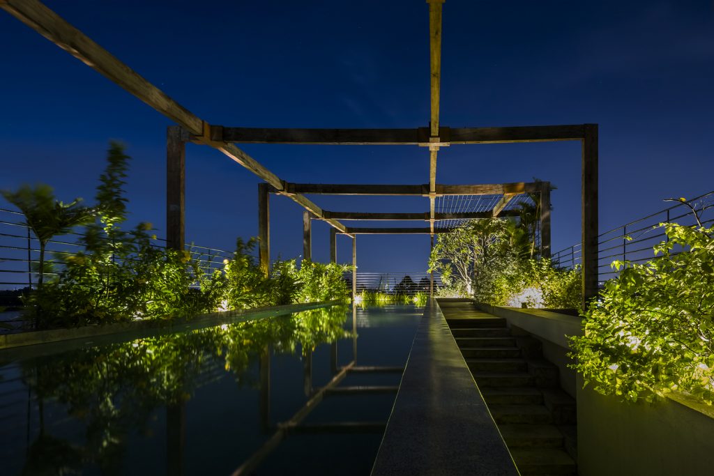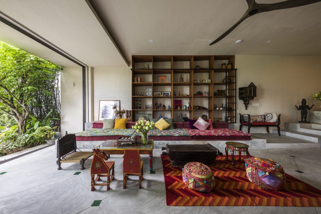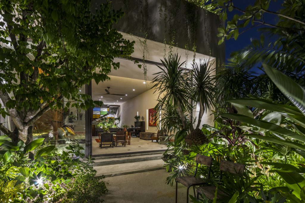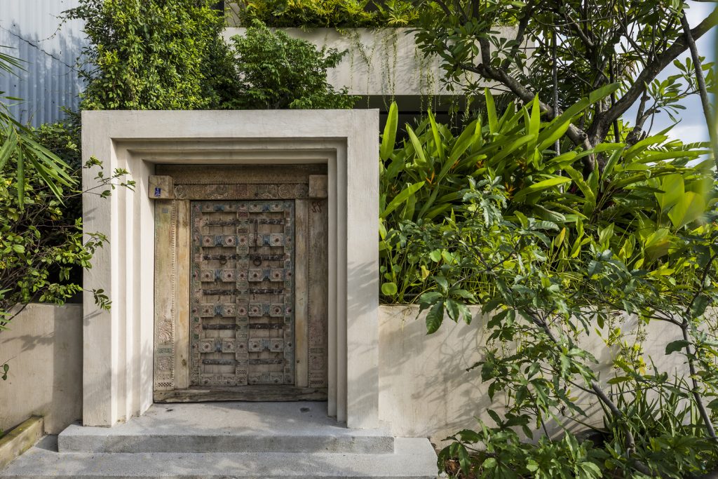 Một con đường đi bộ quanh co giữa cánh cửa kiên cố kiểu Ấn Độ lõm vào trong sẽ dẫn bạn đến phòng khách ngoài trời, qua một khu vườn vui nhộn nằm trên mặt phố, khuất khỏi bên ngoài. Khu vườn được trải khắp ngôi nhà, nhờ đó thực vật được tự do ngự trị giữa các tầng, tô điểm cho các dạng khối cơ bản của cấu trúc.