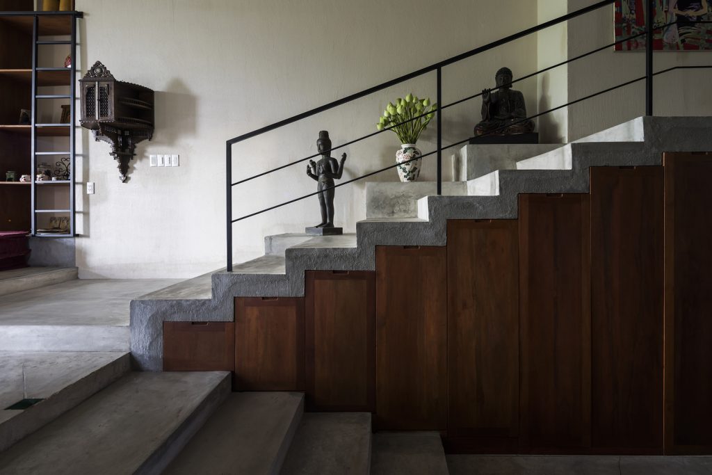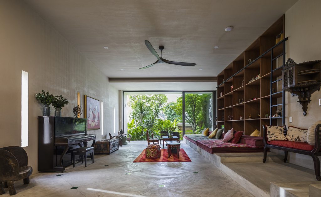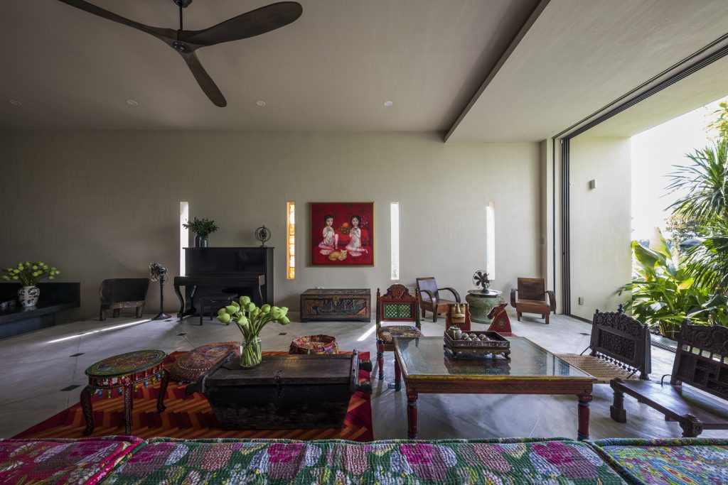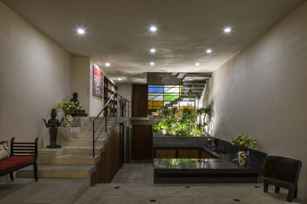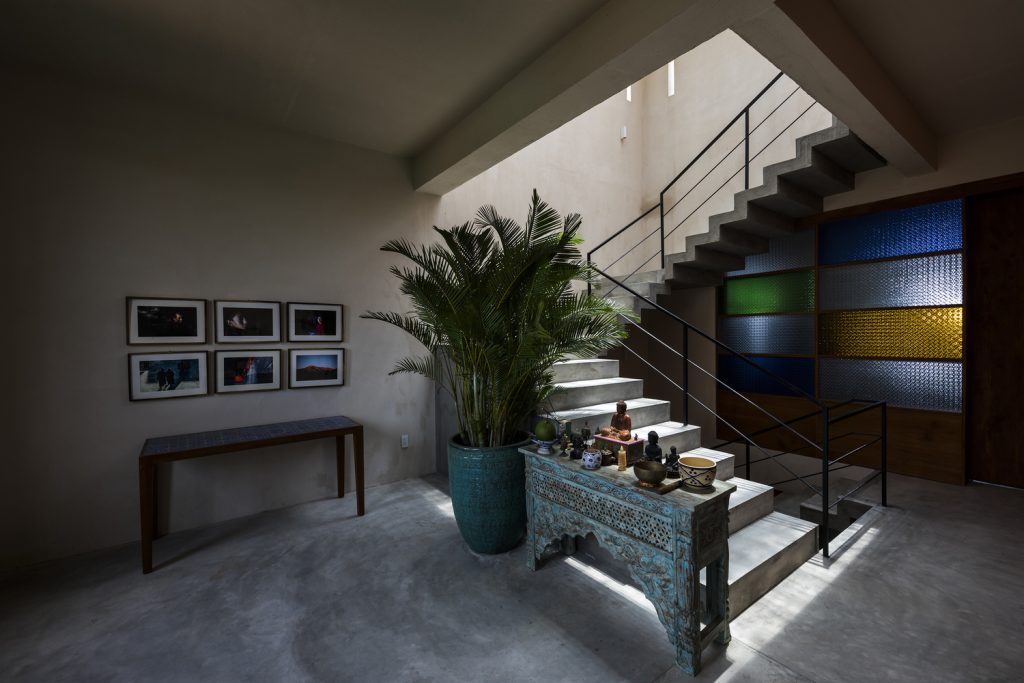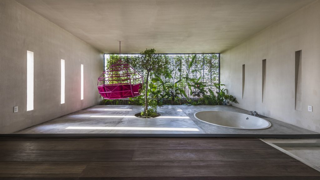 Các khe hở theo phong cách embrasure được sử dụng thay cho cửa sổ, giúp lưu thông không khí và ánh sáng mặt trời vào nhà. Chúng cũng hoạt động như những chiếc đồng hồ mặt trời – tạo ra những bóng hình học sắc nét được biên đạo bởi ánh sáng ban ngày, trong khi vẫn bảo vệ căn nhà khỏi cái nóng oi bức của Sài Gòn.