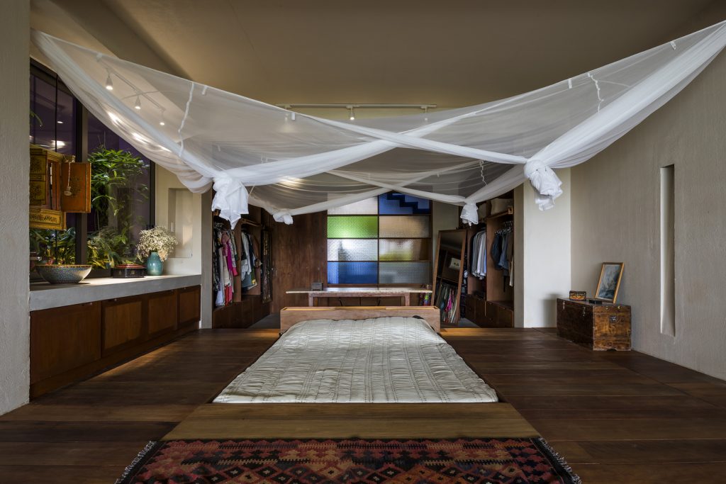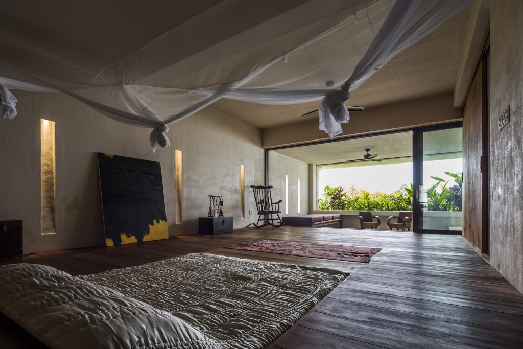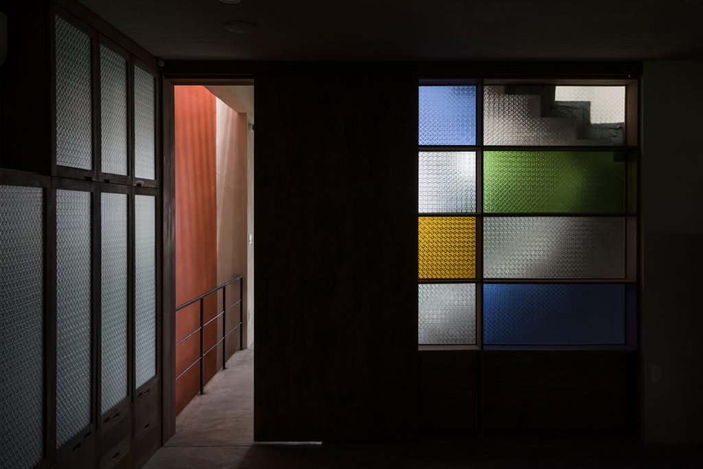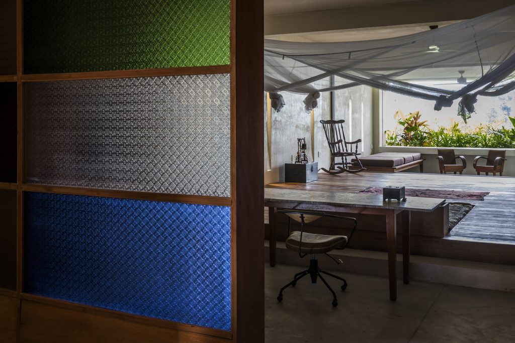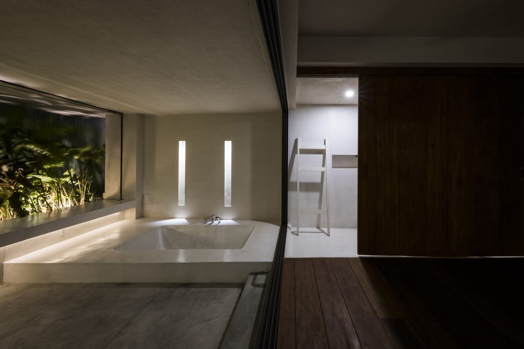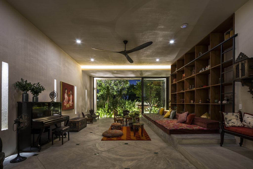 Các khe hở theo phong cách embrasure được sử dụng thay cho cửa sổ, giúp lưu thông không khí và ánh sáng mặt trời vào nhà. Chúng cũng hoạt động như những chiếc đồng hồ mặt trời – tạo ra những bóng hình học sắc nét được biên đạo bởi ánh sáng ban ngày, trong khi vẫn bảo vệ căn nhà khỏi cái nóng oi bức của Sài Gòn.