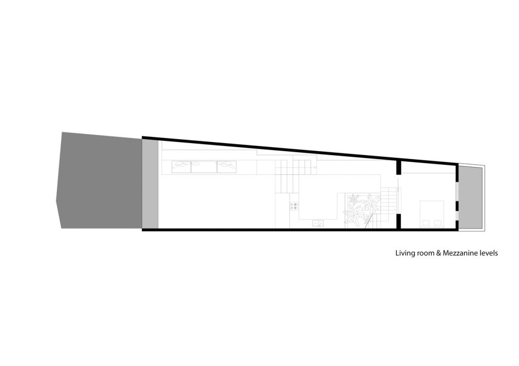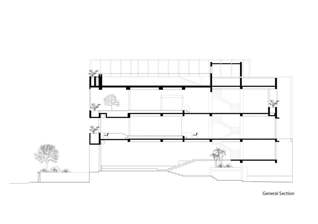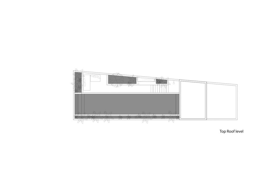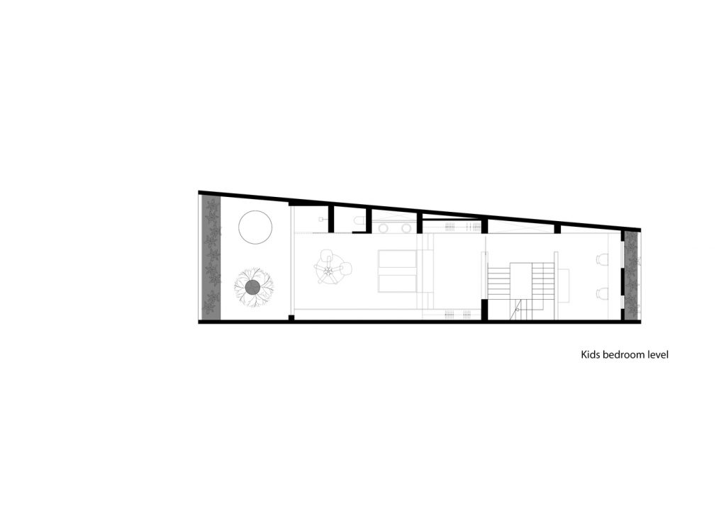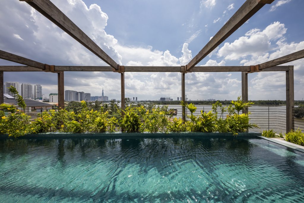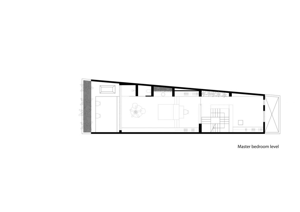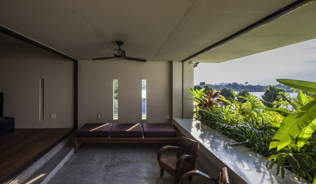 Lô đất hình thang độc đáo, có 2 mặt giáp đường và 2 mặt tiền view sông Sài Gòn, được thiết kế sao cho vừa tầm nhìn và có thể quan sát mọi phía. Ban công được cắt ra từ khung của tòa nhà thay vì nhô ra bên ngoài. Phương pháp trừ lùi này cung cấp bóng râm và vẫn có những khung nhìn toàn cảnh, trong khi vẫn được che giấu khéo léo từ bên ngoài. Giường chính, bồn tắm, chỗ ngồi trong phòng khách được thiết kế liền mạch với căn nhà, tạo ra không gian và tầm nhìn không bị gián đoạn từ tất cả các góc trong phòng.