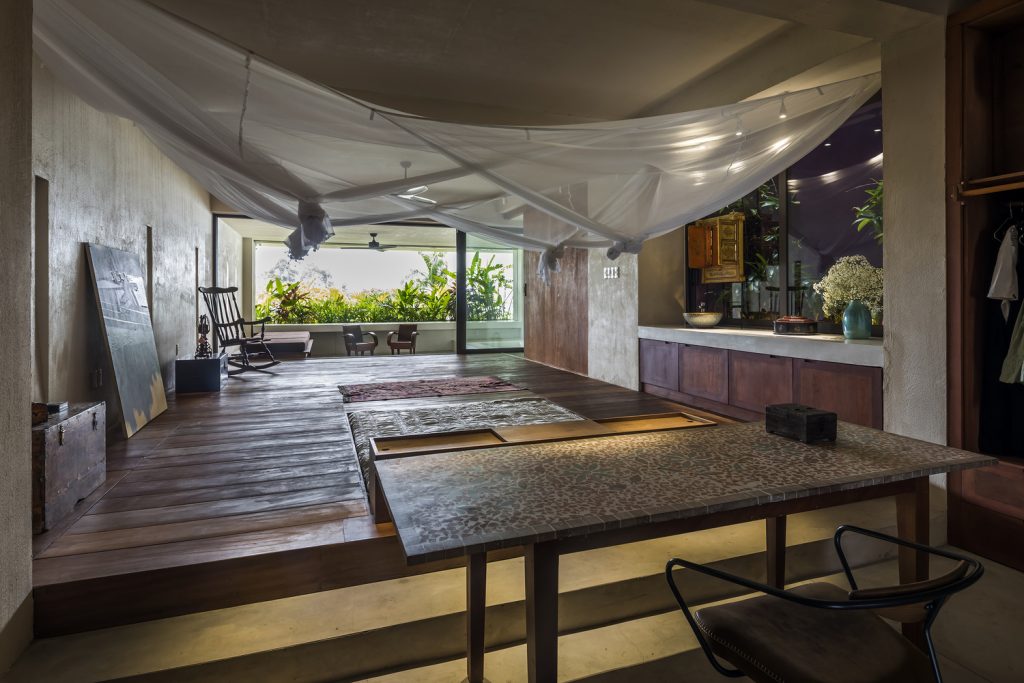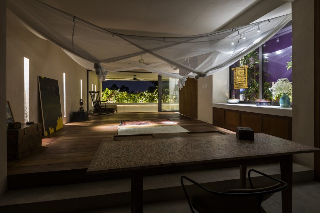 Khu vực tiếp khách tạo cảm giác gần gũi với một băng ghế dát chạy dọc theo chiều dài của không gian nhấn mạnh vào sự trang nhã – mời các bạn ngồi dài, ngả lưng hoặc bắt chéo chân. Không gian được hưởng lợi từ việc đối mặt với nguồn ánh sáng tự nhiên kép của khu vườn và các góc ôm ngược vào bức tường đối diện.