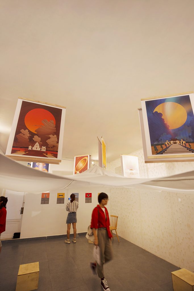 Đối lập với 12 bức giới thiệu thông tin của các công trình theo ảnh trắng đen, ở không gian trưng bày, Todd và team Monosketch cho người xem được “cách ly khỏi mặt đất” và bay trên mây với các tác phẩm được vẽ lại theo phong cách vị lai, siêu thực, đi kèm cùng các điển tích, câu chuyện đằng sau từng công trình.