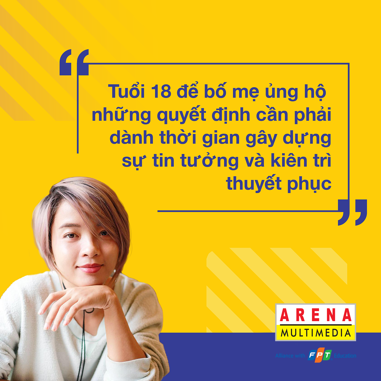 Mình rất may mắn khi luôn được gia đình tôn trọng và ủng hộ mọi quyết định mình đưa ra. Tuy nhiên, đó là kết quả của một thời gian dài mình gây dựng lòng tin ở bố mẹ. Ở tuổi 18, để được phụ huynh ủng hộ, bạn phải dành thời gian để xây dựng sự tin tưởng và kiên trì thuyết phục. Nếu ngay lập tức bạn đòi học về đồ họa mà ngay trước đó không nói cho bố mẹ biết sở thích của bạn là vẽ vời hay sáng tạo thì rất khó để phụ huynh gật đầu.