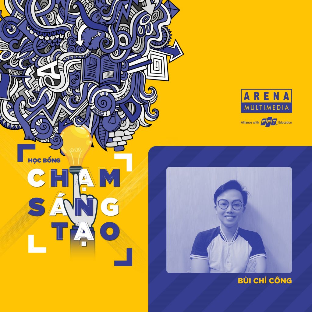Bùi Chí Công – cậu bạn sinh năm 1994 không chỉ sở hữu chuỗi thành tích học tập cực khủng mà còn có được kinh nghiệm làm việc rất phong phú. Bên cạnh đó, Chí Công còn có niềm đam mê rất lớn với thiết kế đồ họa. Cùng với những nỗ lực của mình, Chí Công hoàn toàn xứng đáng với học bổng 50% đến từ “Chạm sáng tạo”