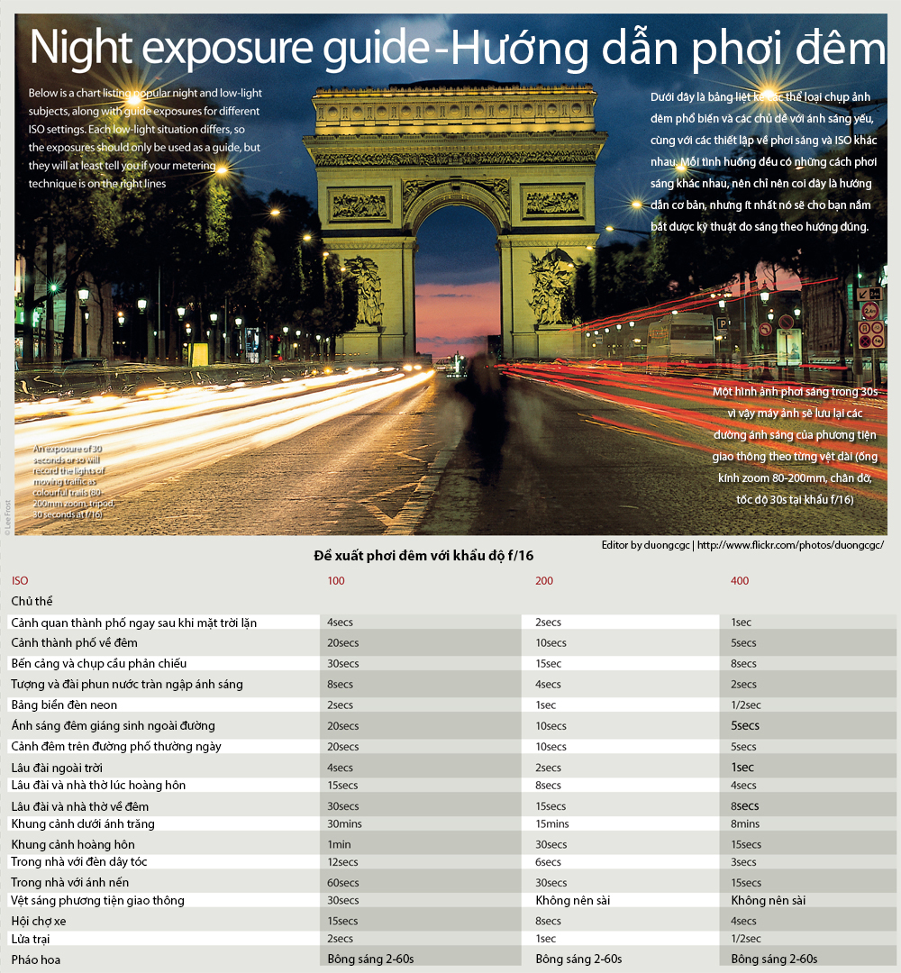 Làm thế nào để phơi sáng dài khi trời tối để chụp những vệt sáng dài trong hình ảnh của bạn (night exposure)? Dưới đây là hướng dẫn và bảng liệt kê các thể loại chụp ảnh đêm phổ biến và các chủ đề với ánh sáng yếu, cùng với các thiết lập về phơi sáng và ISO khác nhau. Mỗi tình huống đều có những cách phơi sáng khác nhau, chỉ nên coi đây là hướng dẫn cơ bản, nhưng ít nhất nó sẽ cho bạn nắm bắt được kỹ thuật đo sáng theo hướng đúng. Nào cùng RGB tìm hiểu những Kiến thức Nhiếp ảnh số cực kỳ hữu ích dưới đây nhé!