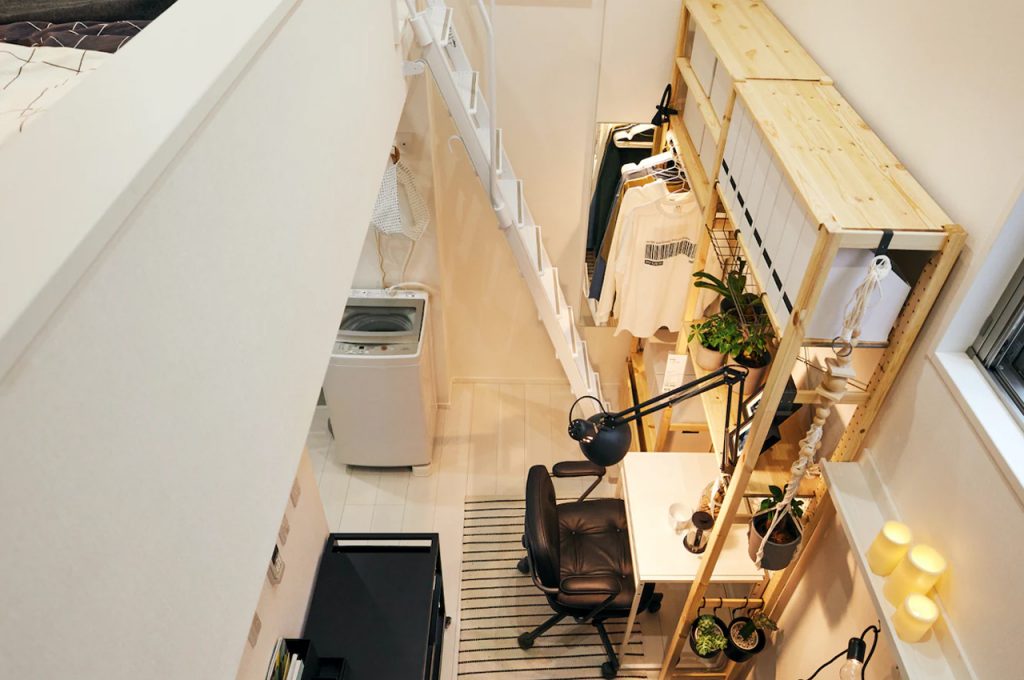 “Một trong những điểm then chốt đó chính là tận dụng tốt không gian dọc”, IKEA Japan tuyên bố. Các hình ảnh cho thấy công ty sử dụng một chiếc giường gác xép để phù hợp với xu hướng work from home và tủ quần áo, cũng như một chiếc sofa giường để nằm thư giãn. Các giải pháp này được bán trong chuỗi cửa hàng của IKEA, vì vậy bạn có thể kết hợp các yếu tố đó trong chính ngôi nhà của mình.