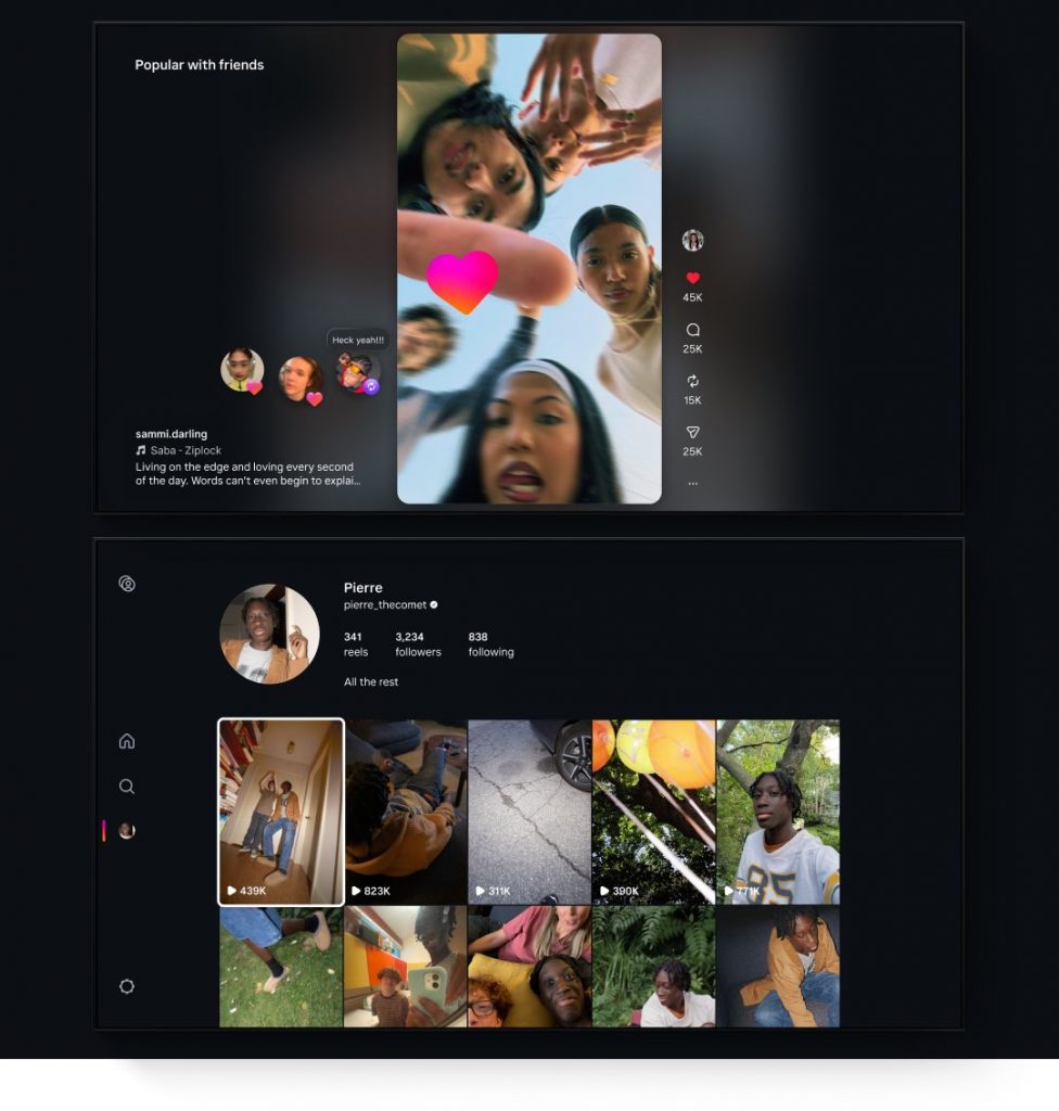 Trải nghiệm được thiết kế riêng cho TV thay vì chỉ “phóng to” từ giao diện di động. Thay cho thao tác cuộn vô hạn bằng ngón tay, các Reels được gom thành những kênh theo sở thích, bao gồm thể thao, âm nhạc, phong cách sống… Video vẫn giữ định dạng dọc, kèm caption và các chỉ số tương tác, nhưng việc điều hướng được tối ưu cho điều khiển từ xa thay vì màn hình cảm ứng. Một ứng dụng TV có thể đăng nhập tối đa 5 tài khoản Instagram, giúp các thành viên trong gia đình giữ riêng phần gợi ý nội dung của mình.