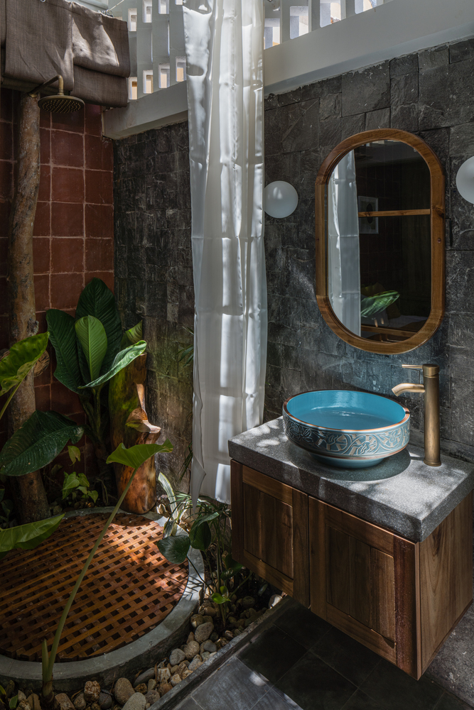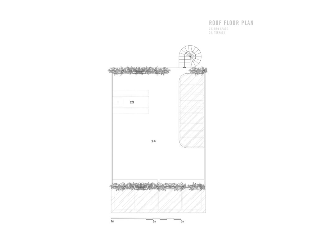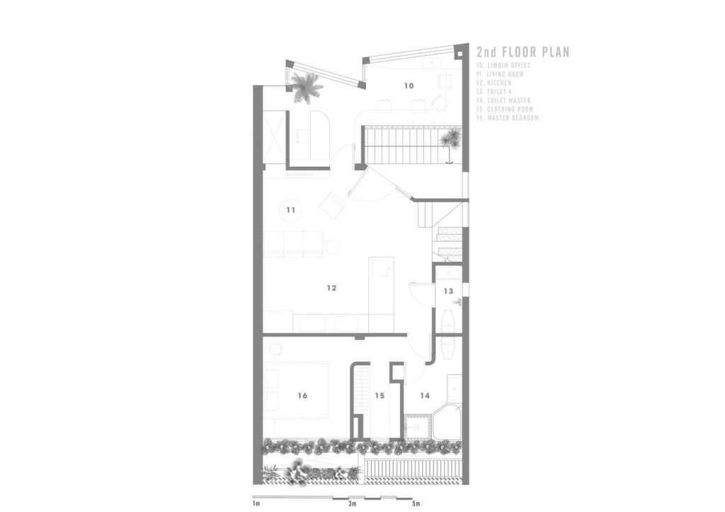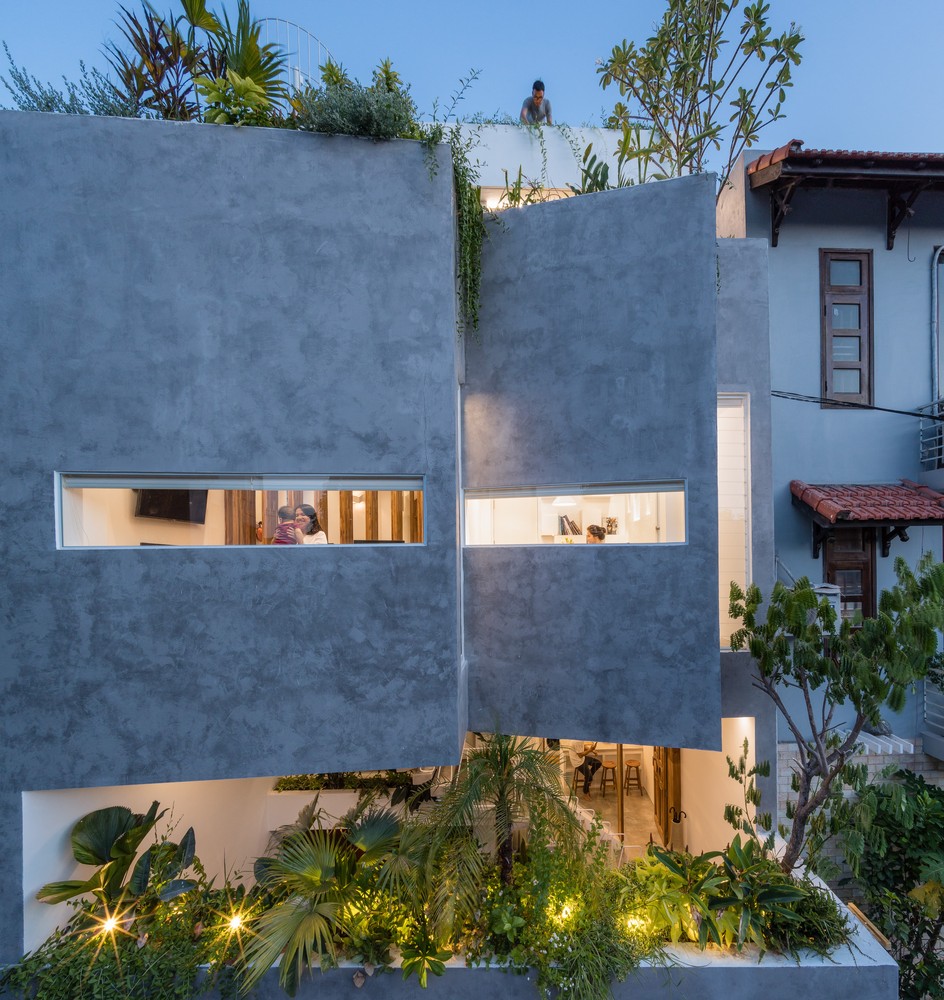 Tận dụng giếng trời và hệ thống thông gió ở phía sau, KTS cho trồng một khu vườn trong nhà ngay sau bức tường chắn gió để tạo mảng xanh cho ngôi nhà. Khu vườn này đóng vai trò điều hòa không khí tự nhiên, giúp không khí mát và sạch hơn trước khi vào bên trong nhà cũng như giảm nhiệt do bức xạ mặt trời. Khu vườn này cũng cung cấp tầm nhìn thoáng đãng xanh mát từ phòng ngủ và phòng tắm, mang đến cho gia chủ cảm giác thư thái, hòa mình vào thiên nhiên.