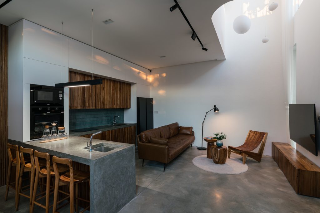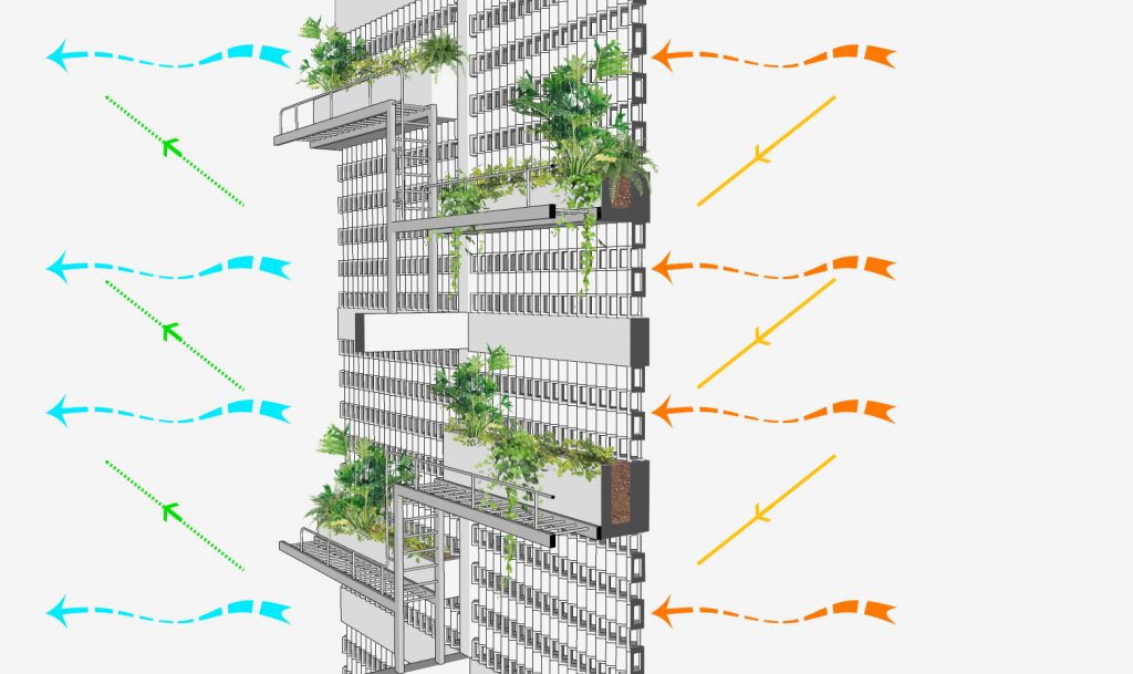 Bức tường chắn gió ở phía sau mang lại không khí và ánh sáng cho ngôi nhà, đồng thời ngăn tác động của nhiệt vào mùa hè và mưa lạnh vào mùa đông. Hệ thống này kết hợp với giếng trời và cửa kính ở mặt tiền đảm bảo phân bổ đủ ánh sáng mặt trời vào ban ngày. Nó cũng tạo sự thông thoáng và đối lưu không khí cho ngôi nhà.