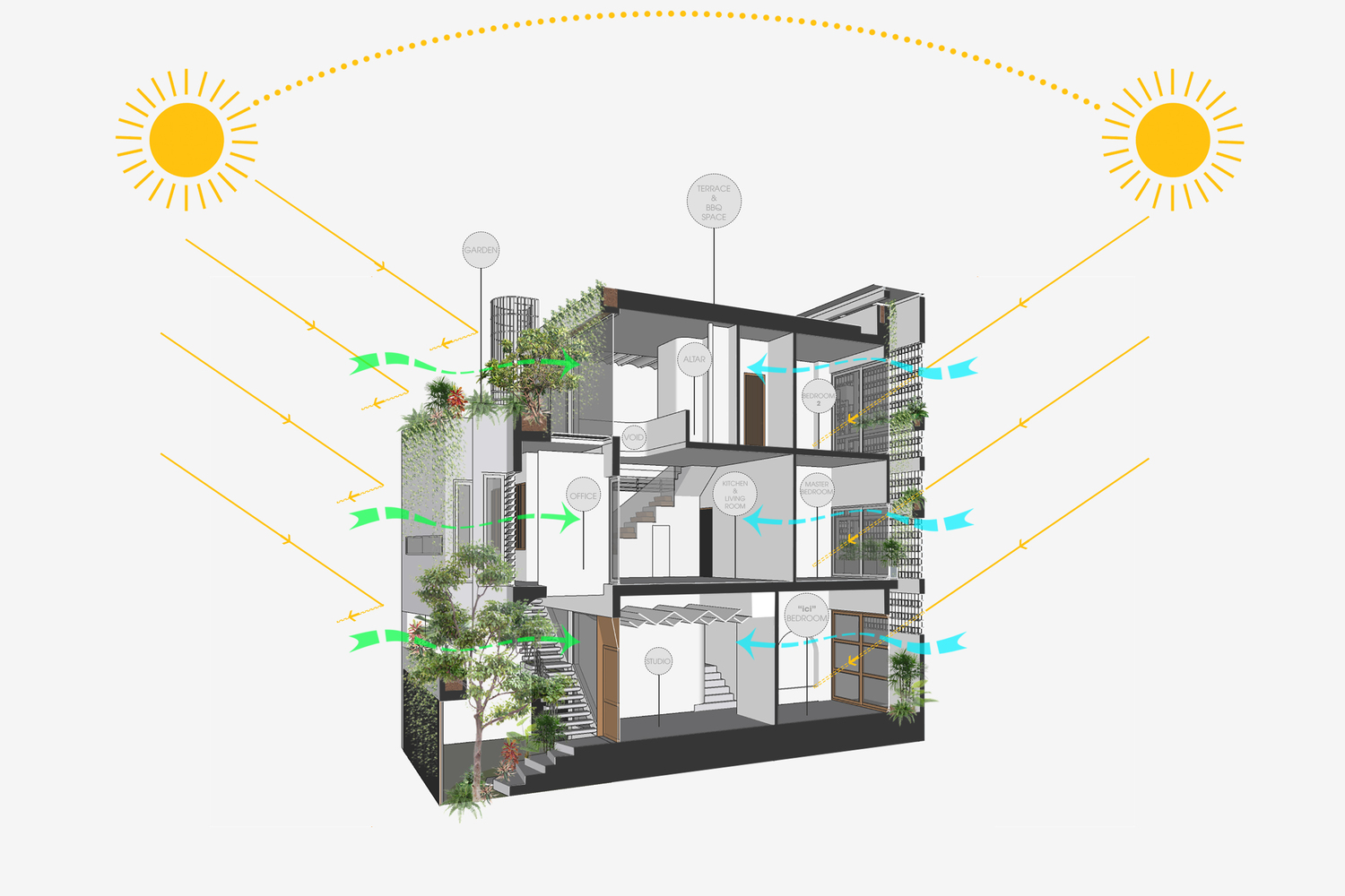 Bức tường chắn gió ở phía sau mang lại không khí và ánh sáng cho ngôi nhà, đồng thời ngăn tác động của nhiệt vào mùa hè và mưa lạnh vào mùa đông. Hệ thống này kết hợp với giếng trời và cửa kính ở mặt tiền đảm bảo phân bổ đủ ánh sáng mặt trời vào ban ngày. Nó cũng tạo sự thông thoáng và đối lưu không khí cho ngôi nhà.