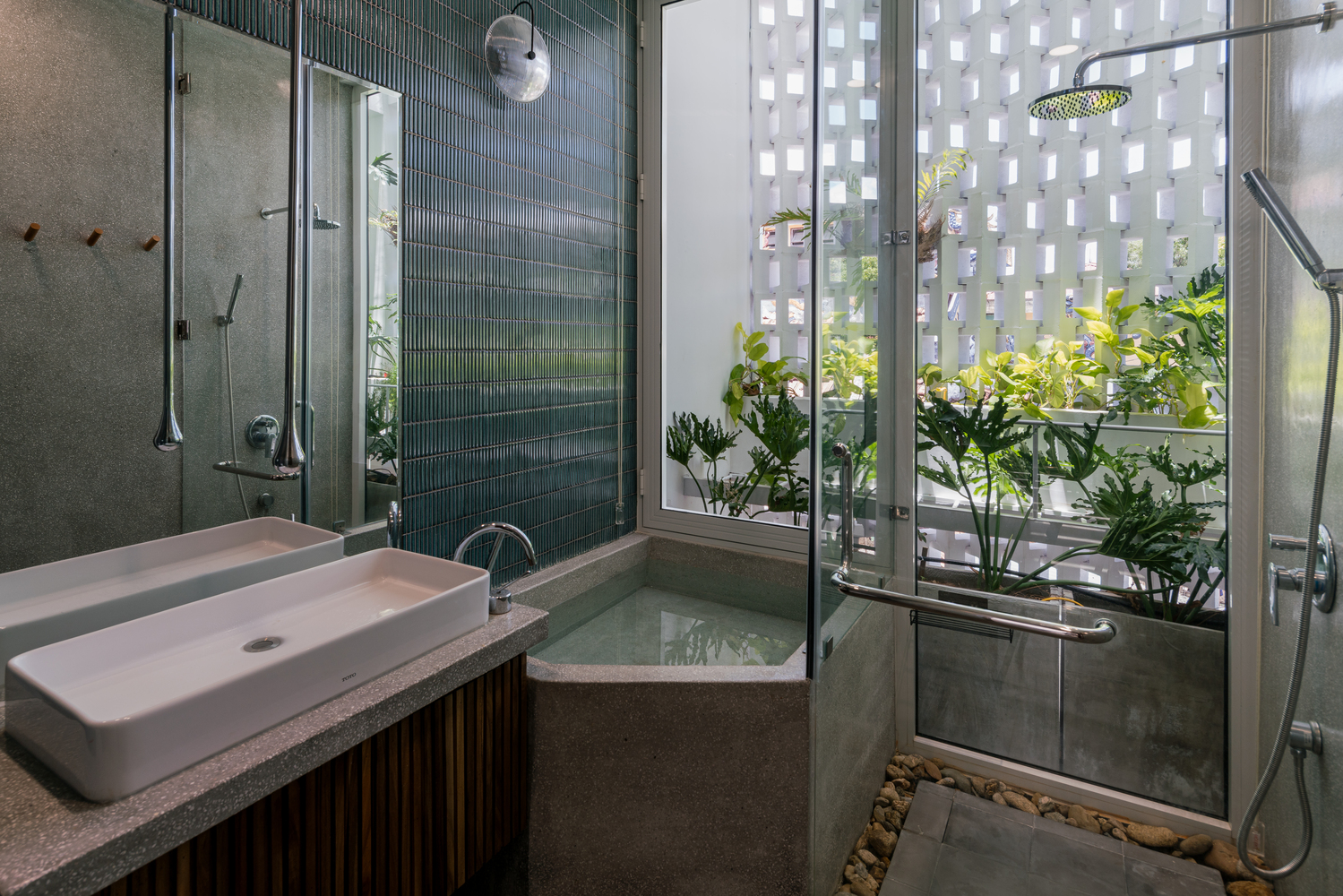 Tận dụng giếng trời và hệ thống thông gió ở phía sau, KTS cho trồng một khu vườn trong nhà ngay sau bức tường chắn gió để tạo mảng xanh cho ngôi nhà. Khu vườn này đóng vai trò điều hòa không khí tự nhiên, giúp không khí mát và sạch hơn trước khi vào bên trong nhà cũng như giảm nhiệt do bức xạ mặt trời. Khu vườn này cũng cung cấp tầm nhìn thoáng đãng xanh mát từ phòng ngủ và phòng tắm, mang đến cho gia chủ cảm giác thư thái, hòa mình vào thiên nhiên.