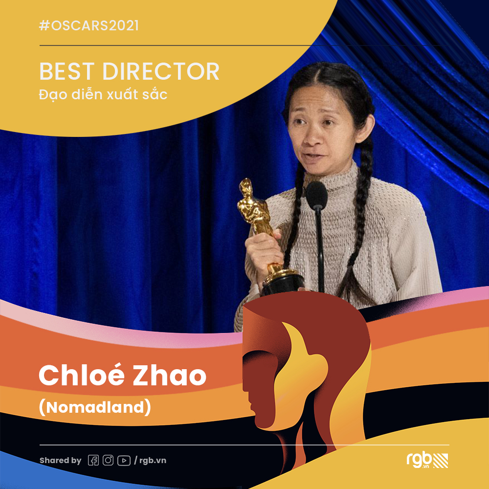 Nữ đạo diễn gốc Hoa Chloé Zhao xuất sắc giành giải thưởng quan trọng này với bộ phim “Nomadland”. Cô là người phụ nữ thứ hai từng giành được giải Oscar này, sau Kathryn Bigelow (“The Hurt Locker”).
