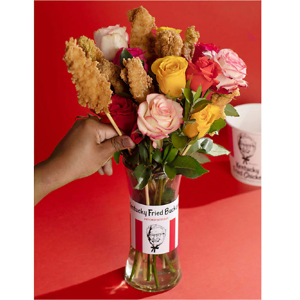 “Bó hoa” này gồm có 12 bông hồng nhiều màu (hợp tác với dịch vụ giao hoa Proflowers), một lọ hoa bằng kính, một miếng dán lọ với logo của KFC, một tấm thiếp mừng Ngày của Mẹ, và 8 thanh gỗ xiên nướng.