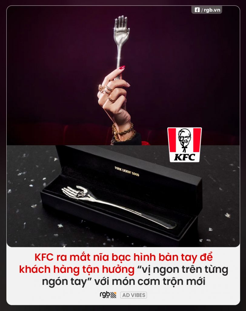 Sau khi ra mắt cơm trộn “Rice Bowl”, cộng đồng phản hồi rằng món mới của KFC “ngon khó cưỡng nhưng nhiều sốt nên khó có thể ăn bằng tay”. KFC đã nhanh trí hợp tác cùng agency Mother ra mắt chiếc nĩa có hình dáng bàn tay bạc đầy ấn tượng, được chế tác thủ công bởi nghệ nhân trang sức Sam Ozanne. Đây không chỉ là một món dụng cụ tiện ích mà còn là một “tác phẩm nghệ thuật” dành riêng cho những fan cuồng của KFC.