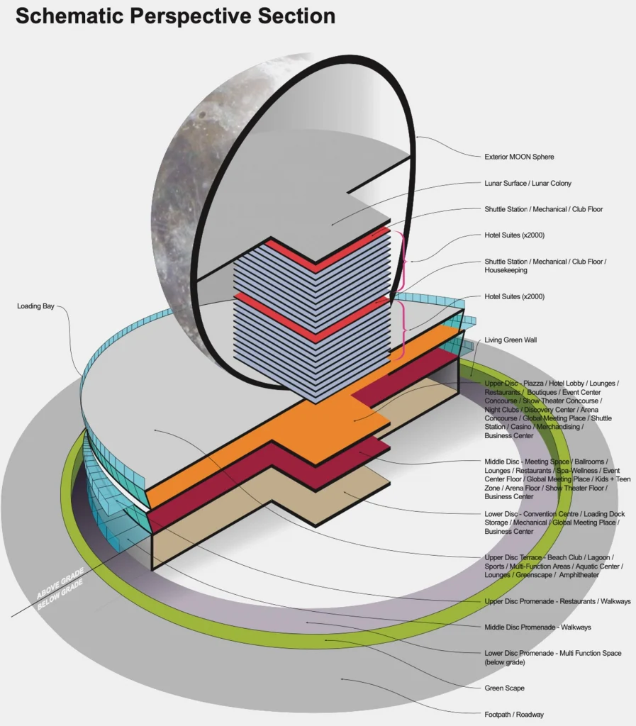 Được đặt tên là Moon, khu nghỉ dưỡng sẽ bao gồm một cấu trúc thép hình cầu có bề mặt giống như Mặt Trăng bao quanh một khách sạn xây dựng trên một khối đế hình tròn ba tầng.