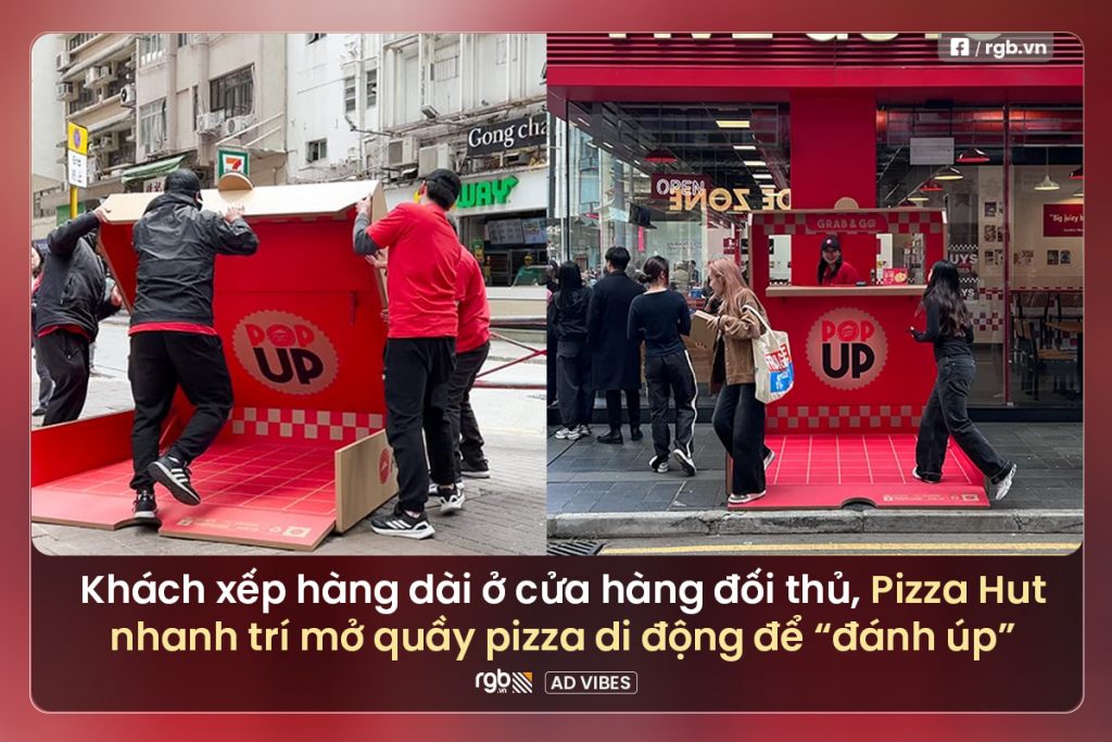 Pizza Hut vừa triển khai một chiến dịch marketing sáng tạo nhằm thu hút khách hàng từ các đối thủ cạnh tranh. “Pop-Up Pizza Hut” – một quầy pizza di động được thiết kế như một hộp pizza khổng lồ có thể mở ra, phục vụ các phần ăn nhanh Meal-For-One ngay tại những hàng chờ dài ở các nhà hàng đối thủ trong giờ ăn trưa.