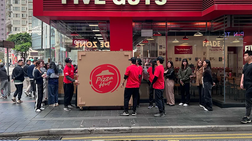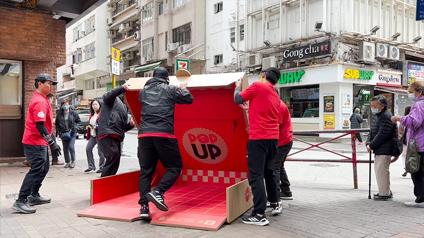 Hợp tác với agency Edelman Hong Kong, Pizza Hut triển khai chiến dịch với một quầy hàng di động hình hộp pizza khổng lồ có thể gập/mở nhanh chóng, chuyên phục vụ những phần ăn nhanh “Meal-for-One” (suất ăn cá nhân) ngay tại… hàng chờ của các nhà hàng đối thủ. Những quầy hàng pop-up này nhằm nhắc nhở các thực khách đang đói bụng rằng: không cần chờ đợi mới được ăn ngon.