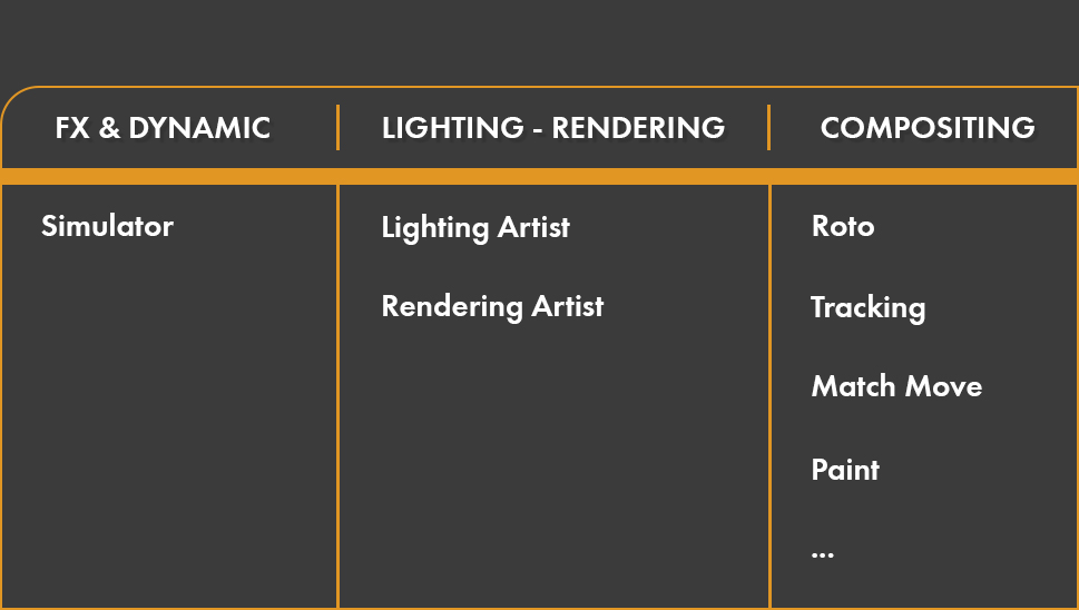 Tùy thuộc vào dự án và kinh phí mà team Hậu kỳ của VFX sẽ có những vị trí khác nhau. Tuy nhiên, hầu hết các Studio tại Việt Nam sẽ có những công đoạn như Concept, Asset, Animation, FX & Dynamic, Lighting, Rendering, Compositing với nhiều vị trí không thể thiếu.