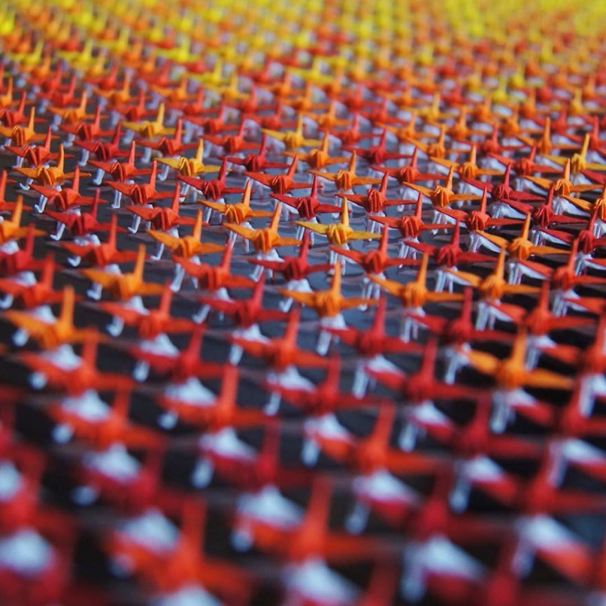 Được truyền cảm hứng từ huyền thoại 1000 hạc giấy và câu chuyện về cô bé Sadako Sasaki, nghệ nhân Naoki Onogawa đã kỳ công xếp hàng nghìn con hạc giấy tí hon và tỉ mỉ ghép nối chúng lại thành những cây bonsai đủ màu sắc, kiểu dáng.