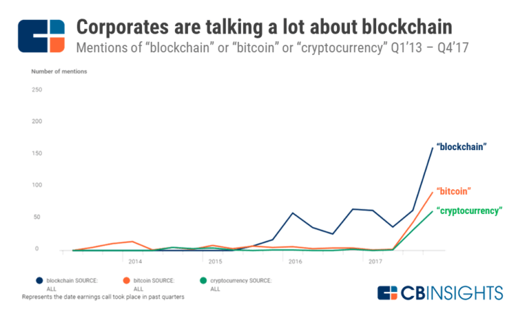 ● Trước năm 2015 những doanh nghiệp đề cập đến blockchain, bitcoin, cryptocurrency chỉ dao động nhỏ hay thậm chí chẳng có gì đặc sắc. Nhưng từ năm 2016 trở đi, tỷ lệ này bắt đầu có sự khởi sắc và kết quả là sự biến đổi đột ngột vào năm 2017 (Theo báo cáo từ Cbinsights).