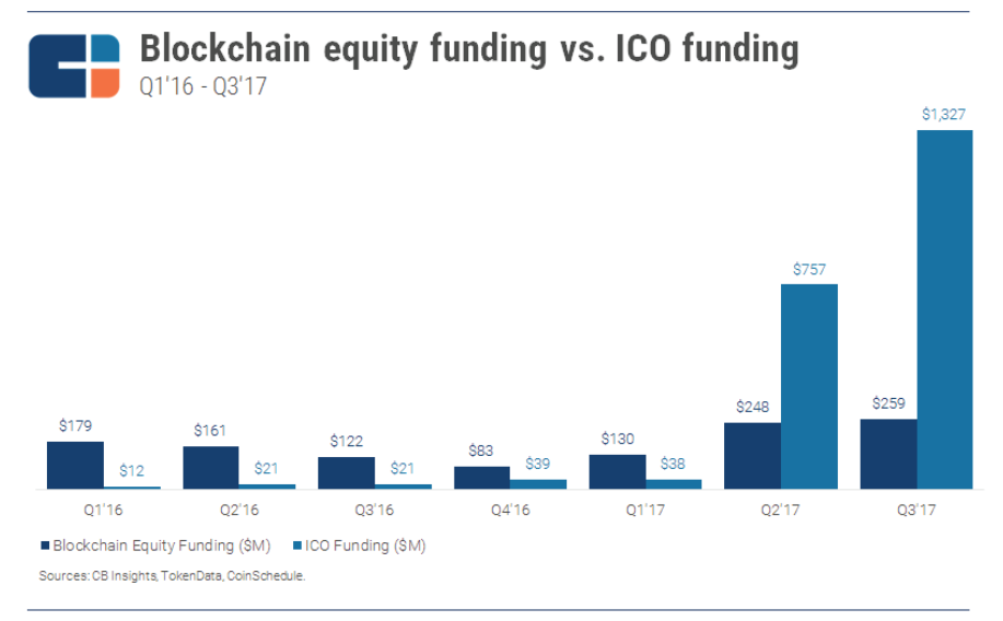 (Hình 02: Biểu đồ về vốn cổ phần và vốn từ ICO theo quý) ● Theo Cbinsights, tính cho đến nay: tổng vốn trên thị trường dành cho tiền điện tử gần đạt đến con số 150 tỷ đô la Mỹ (với một giao dịch bitcoin lên tới 5000 đô la Mỹ), Walmart và Pfizer đã thành công trong việc thử nghiệm blockchain vào an toàn thực phẩm và theo dõi y học.
