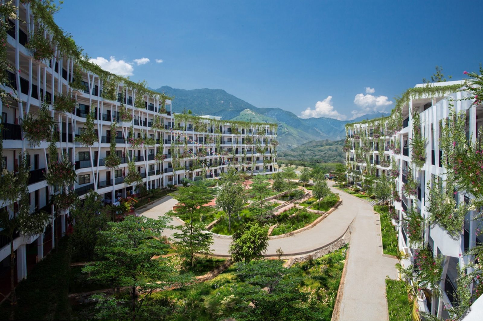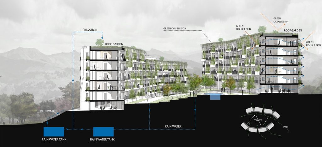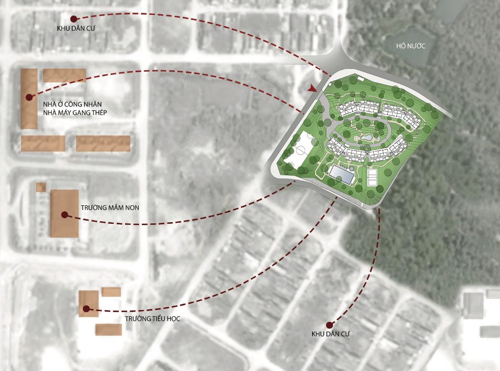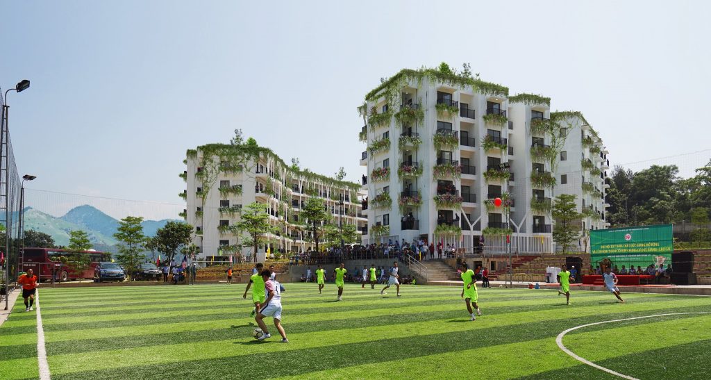 Thiết kế tận dụng địa hình, độ dốc tự nhiên, giảm khối lượng san lấp, tạo thành các ruộng bậc thang – nét đặc trưng của vùng núi phía Bắc. Ngoài khoảng sân giữa các khối nhà, diện tích mái cũng được tận dụng trồng rau, nông sản địa phương. Công nhân tự tay chăm sóc, thu hoạch và trao đổi các sản phẩm nông nghiệp, giảm nỗi lo thực phẩm bẩn độc hại cũng như một cách thư giãn sau giờ làm việc. Nước thải sinh hoạt sau xử lý, nước mưa, nước mặt đưa vào các bể chứa ở các cao độ khác nhau, dùng tưới cây tự động. Nhà, vườn, sân sinh hoạt chung, sân bóng đá, bóng chuyền, bể bơi tạo nên sự kết nối cư dân sinh sống như một không gian làng xóm thân thiện, bền vững.