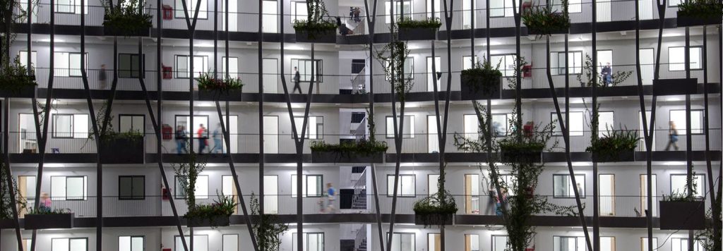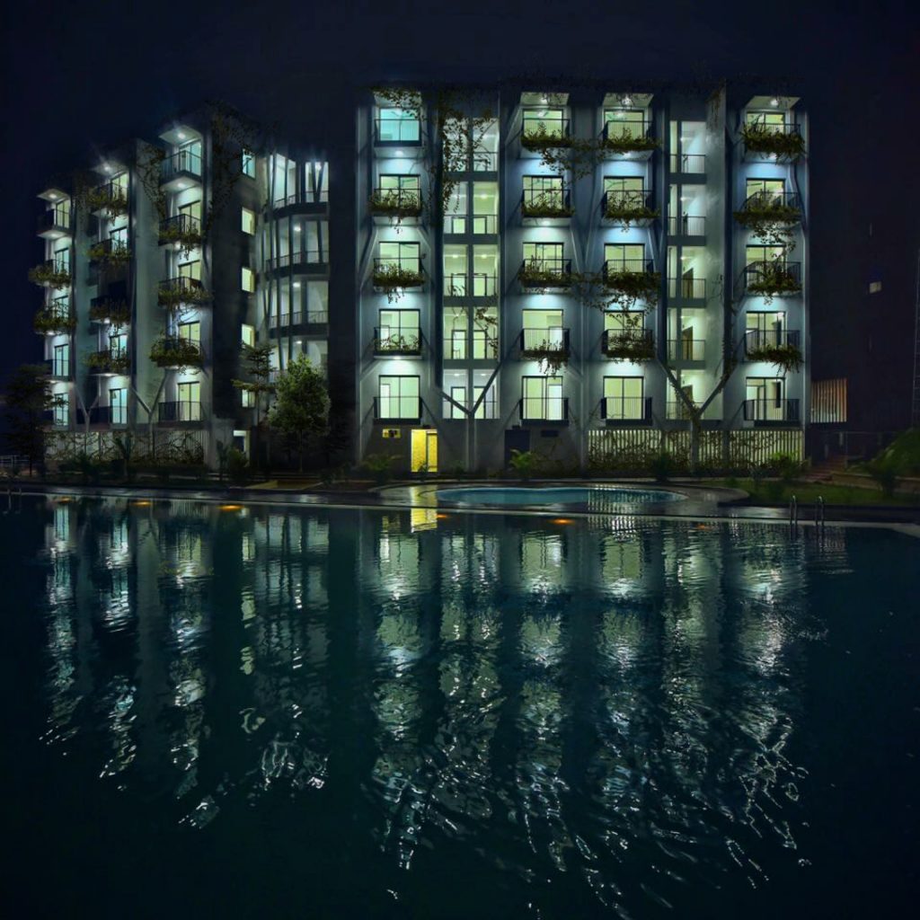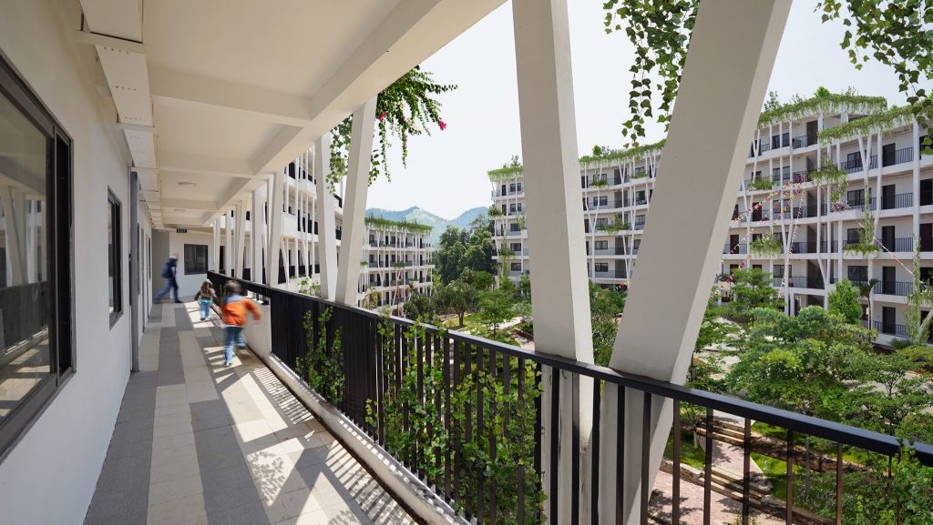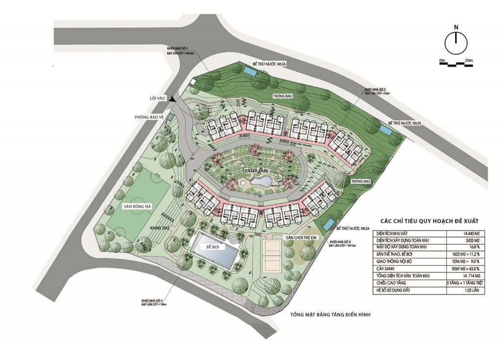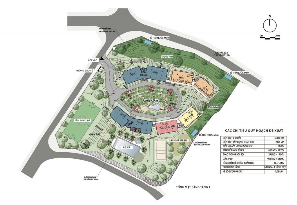 Thiết kế tận dụng địa hình, độ dốc tự nhiên, giảm khối lượng san lấp, tạo thành các ruộng bậc thang – nét đặc trưng của vùng núi phía Bắc. Ngoài khoảng sân giữa các khối nhà, diện tích mái cũng được tận dụng trồng rau, nông sản địa phương. Công nhân tự tay chăm sóc, thu hoạch và trao đổi các sản phẩm nông nghiệp, giảm nỗi lo thực phẩm bẩn độc hại cũng như một cách thư giãn sau giờ làm việc. Nước thải sinh hoạt sau xử lý, nước mưa, nước mặt đưa vào các bể chứa ở các cao độ khác nhau, dùng tưới cây tự động. Nhà, vườn, sân sinh hoạt chung, sân bóng đá, bóng chuyền, bể bơi tạo nên sự kết nối cư dân sinh sống như một không gian làng xóm thân thiện, bền vững.