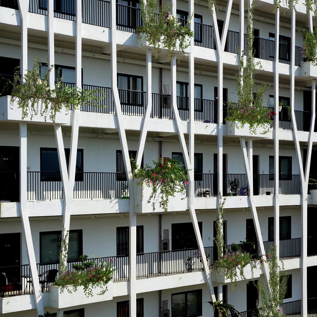 Kiến trúc nhà mỏng, quay hướng Bắc – Nam tránh nắng nóng và đảm bảo tất cả các phòng có ánh sáng, thông gió tự nhiên. Mặt đứng được thiết kế với hệ xương bê tông hình cây kết hợp bồn trồng hoa, cây leo có tác dụng che nắng xiên, tạo hiệu ứng bóng đổ đặc biệt khi di chuyển dọc hành lang.