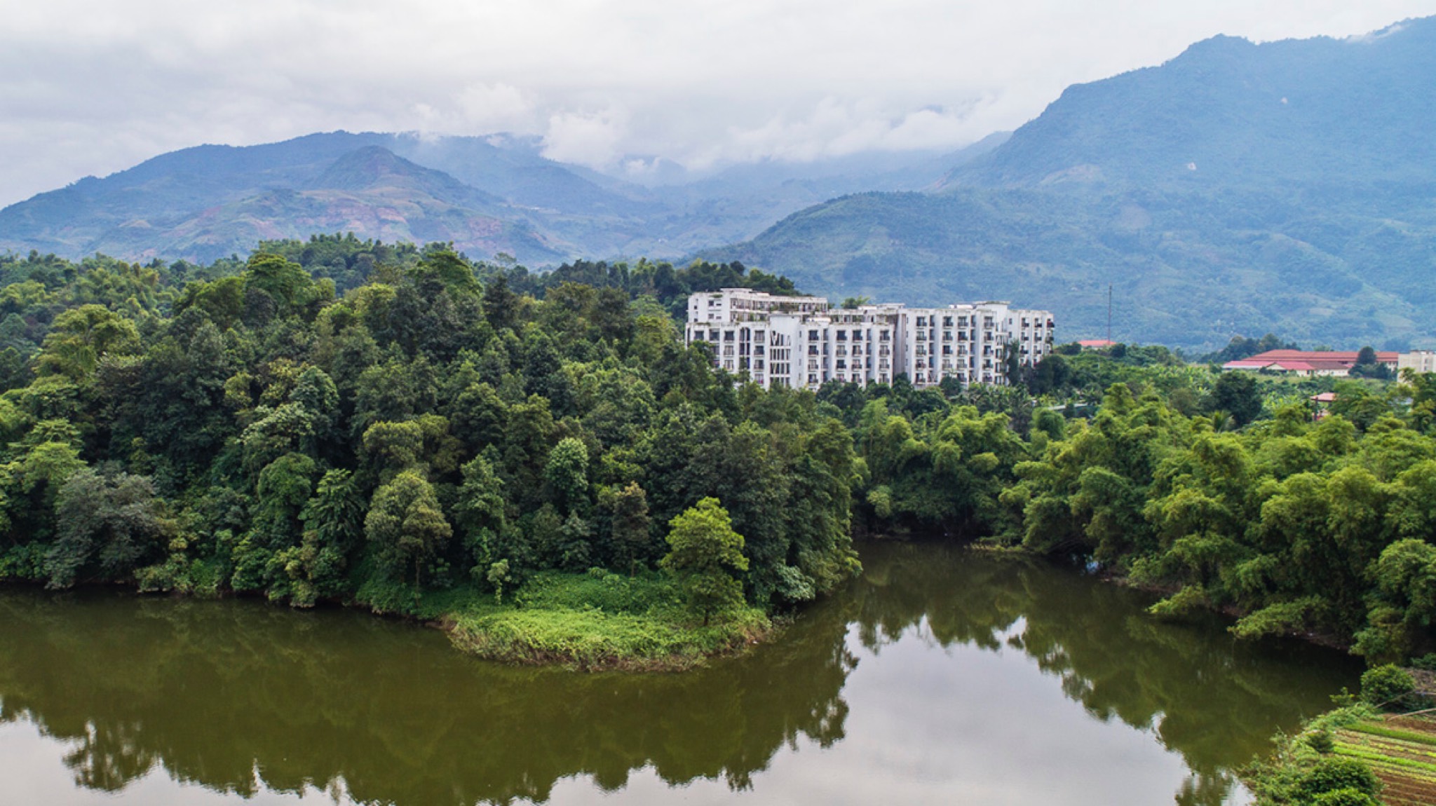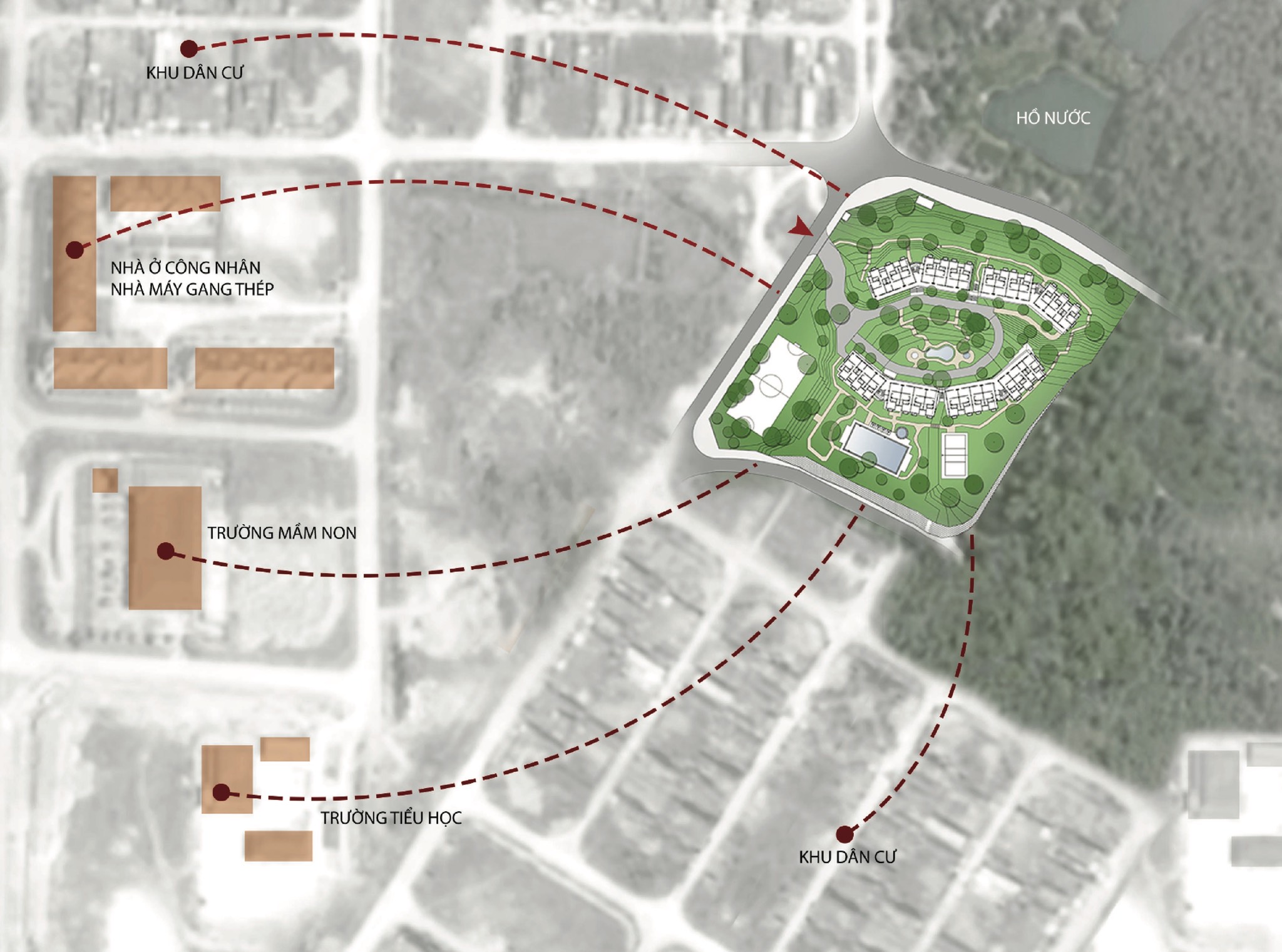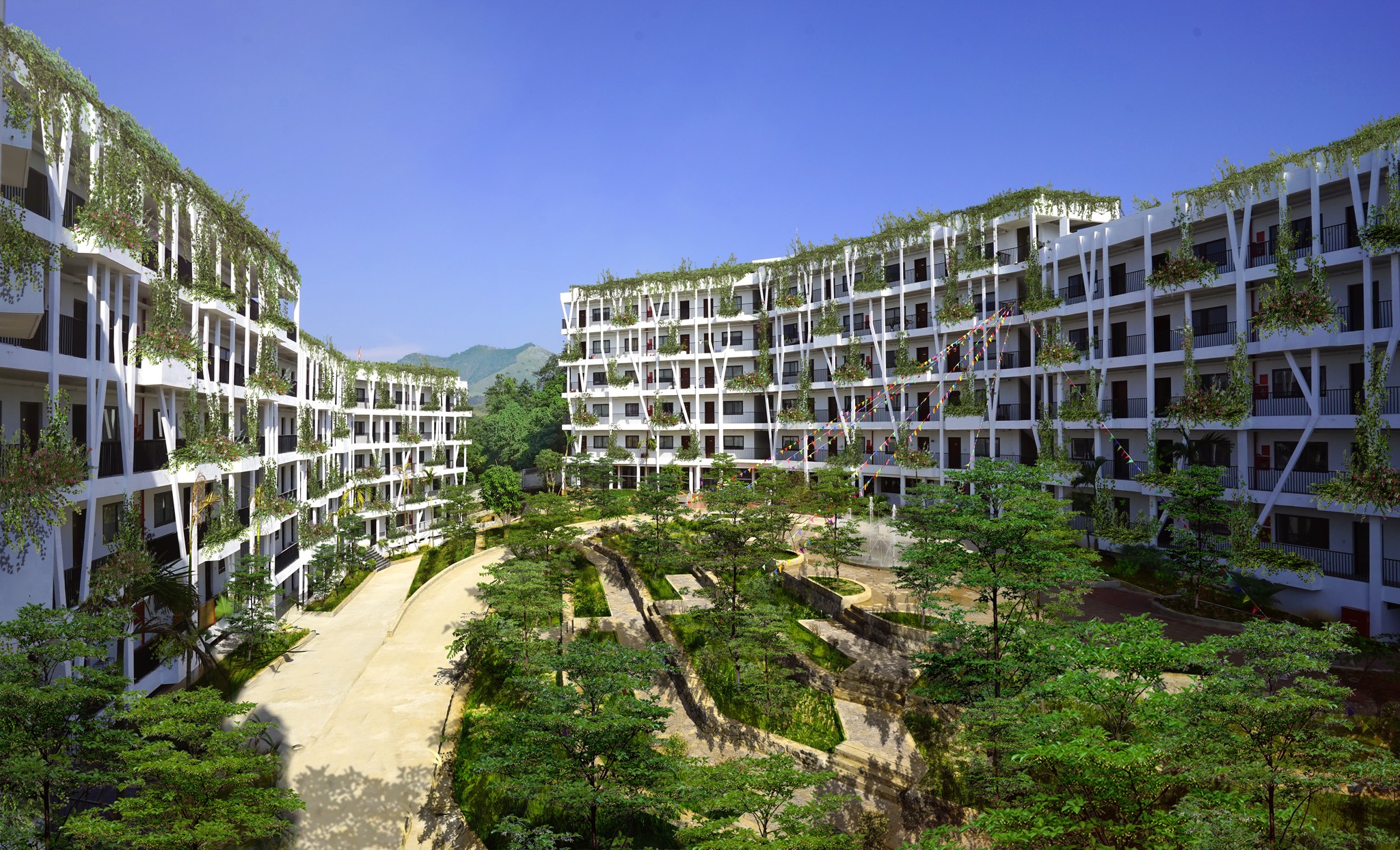 Thiết kế tận dụng địa hình, độ dốc tự nhiên, giảm khối lượng san lấp, tạo thành các ruộng bậc thang – nét đặc trưng của vùng núi phía Bắc. Ngoài khoảng sân giữa các khối nhà, diện tích mái cũng được tận dụng trồng rau, nông sản địa phương. Công nhân tự tay chăm sóc, thu hoạch và trao đổi các sản phẩm nông nghiệp, giảm nỗi lo thực phẩm bẩn độc hại cũng như một cách thư giãn sau giờ làm việc. Nước thải sinh hoạt sau xử lý, nước mưa, nước mặt đưa vào các bể chứa ở các cao độ khác nhau, dùng tưới cây tự động. Nhà, vườn, sân sinh hoạt chung, sân bóng đá, bóng chuyền, bể bơi tạo nên sự kết nối cư dân sinh sống như một không gian làng xóm thân thiện, bền vững.