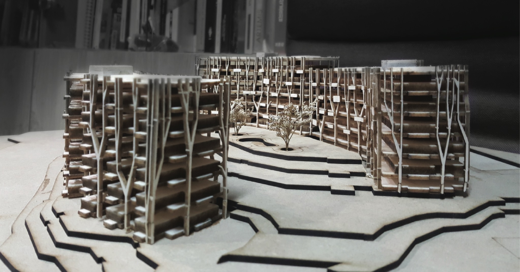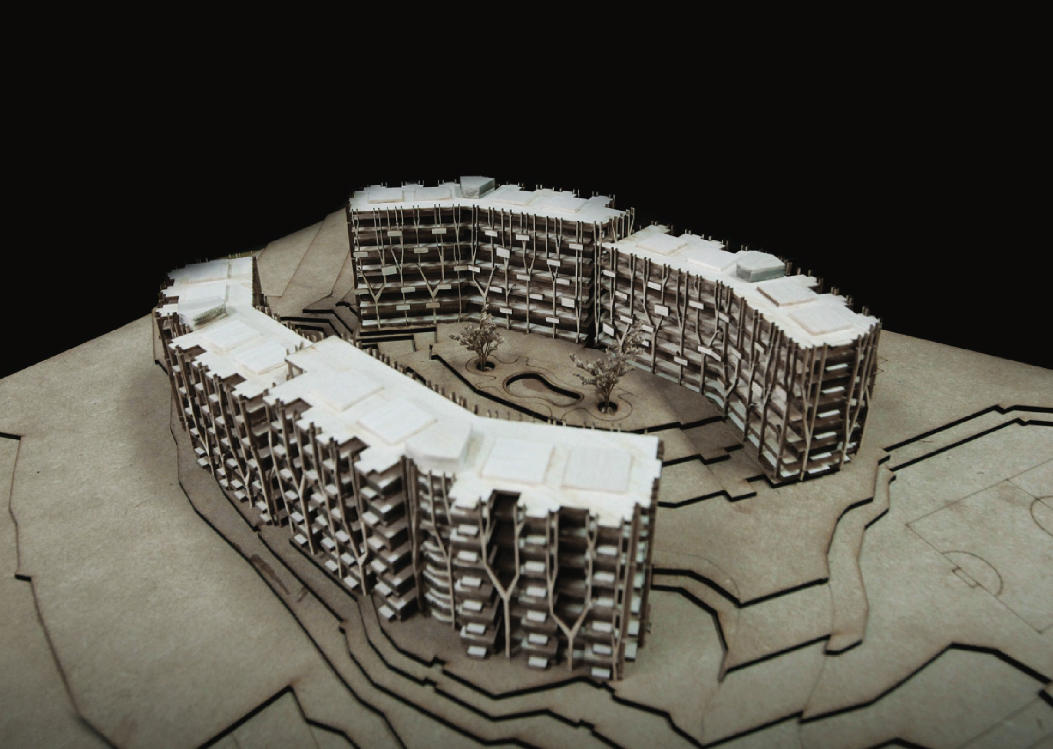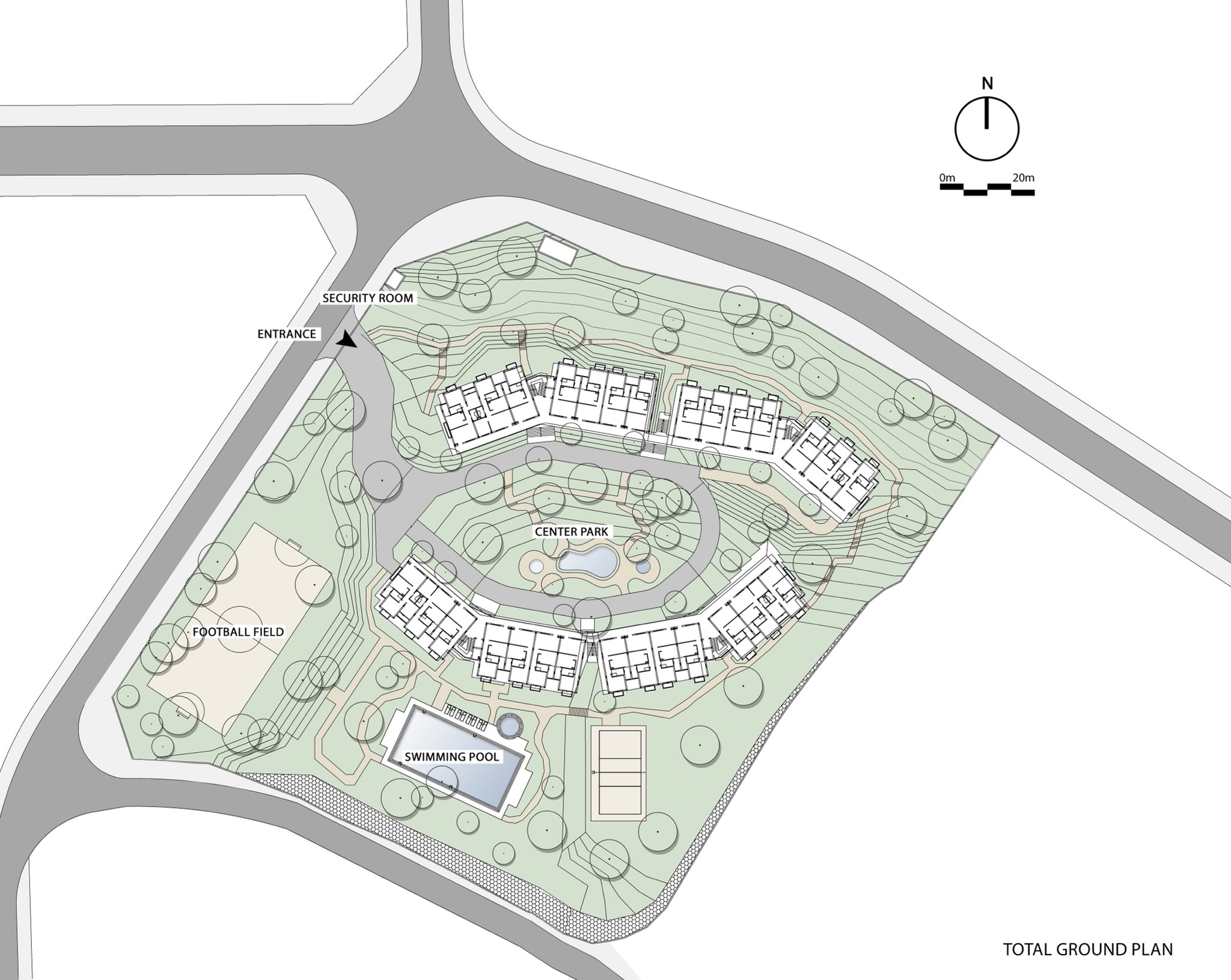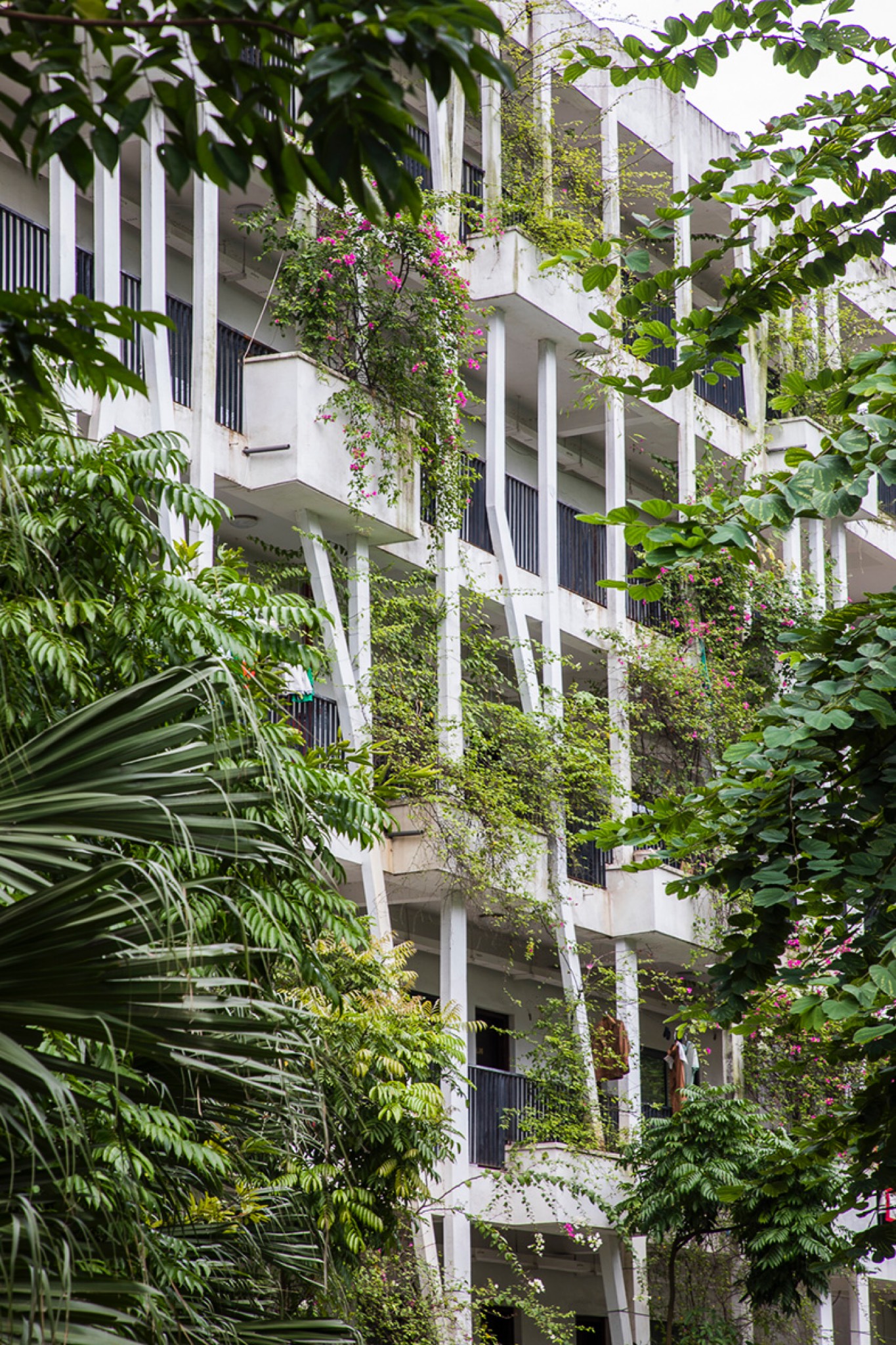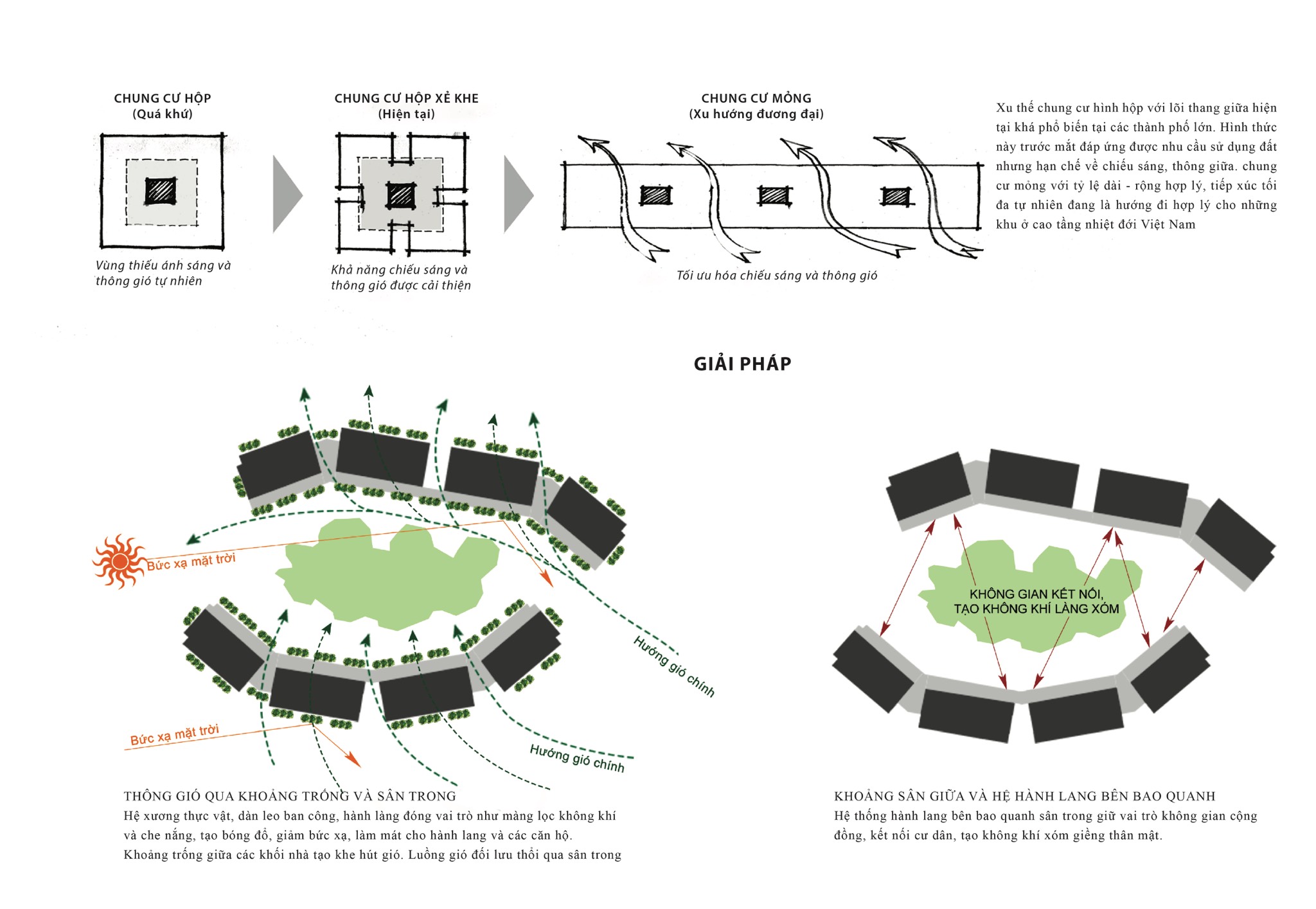 Tổ hợp gồm 4 khối nhà, nằm trên các cốt địa hình chênh khoảng 2.5m, có hành lang thông nhau. Các khối nhà chạy vòng cung dựa theo đường đồng mức tự nhiên, tạo lõi xanh thoáng ở giữa. Khoảng trống giữa các khối và giữa các vị trí thang tạo ra các phễu hút gió, đối lưu thổi qua sân trong.