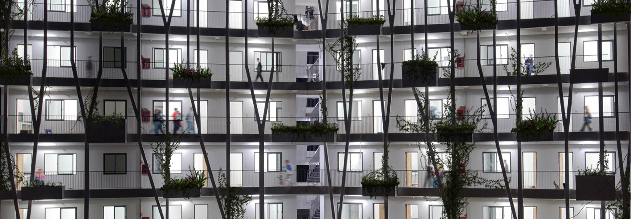 Kiến trúc nhà mỏng, quay hướng Bắc – Nam tránh nắng nóng và đảm bảo tất cả các phòng có ánh sáng, thông gió tự nhiên. Mặt đứng được thiết kế với hệ xương bê tông hình cây kết hợp bồn trồng hoa, cây leo có tác dụng che nắng xiên, tạo hiệu ứng bóng đổ đặc biệt khi di chuyển dọc hành lang.