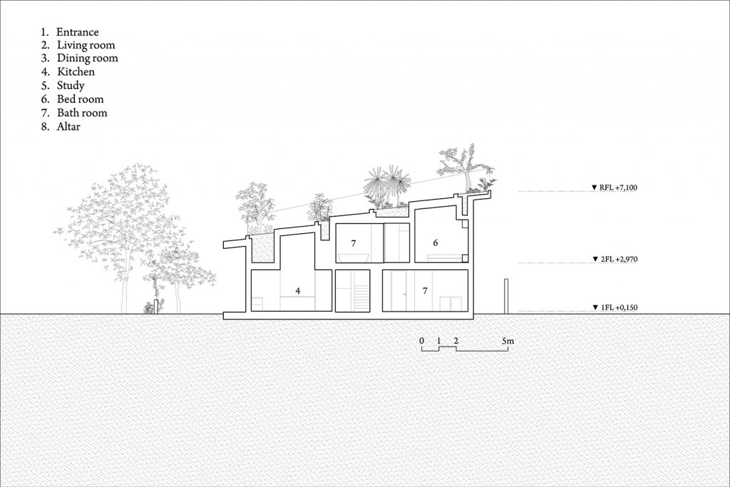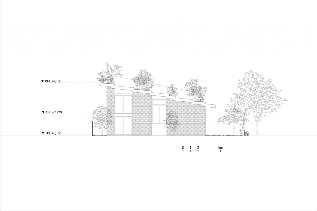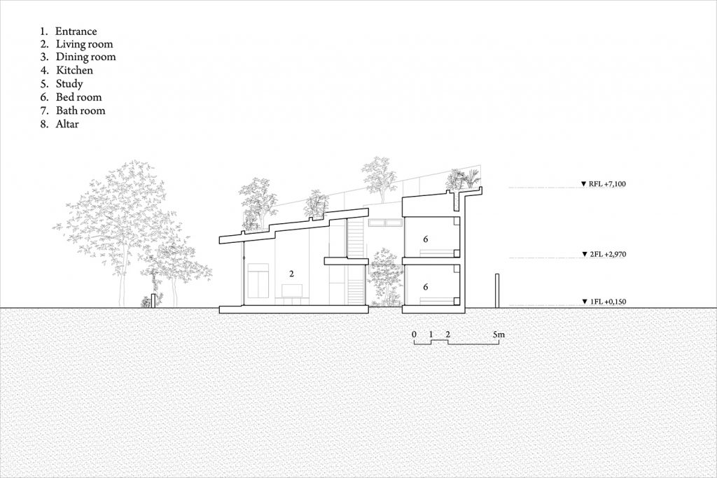 Ngôi nhà là một trong những biến thể của dự án “Nhà Cho Cây” của nhóm KTS Võ Trọng Nghĩa. Có độ dốc nhẹ, cảnh quan trên mái nhà này được kết nối trực quan với những ngọn núi bao quanh. Dưới bóng cây, cư dân có thể ngắm cảnh và trải nghiệm cuộc sống của mình với đầy cây xanh.