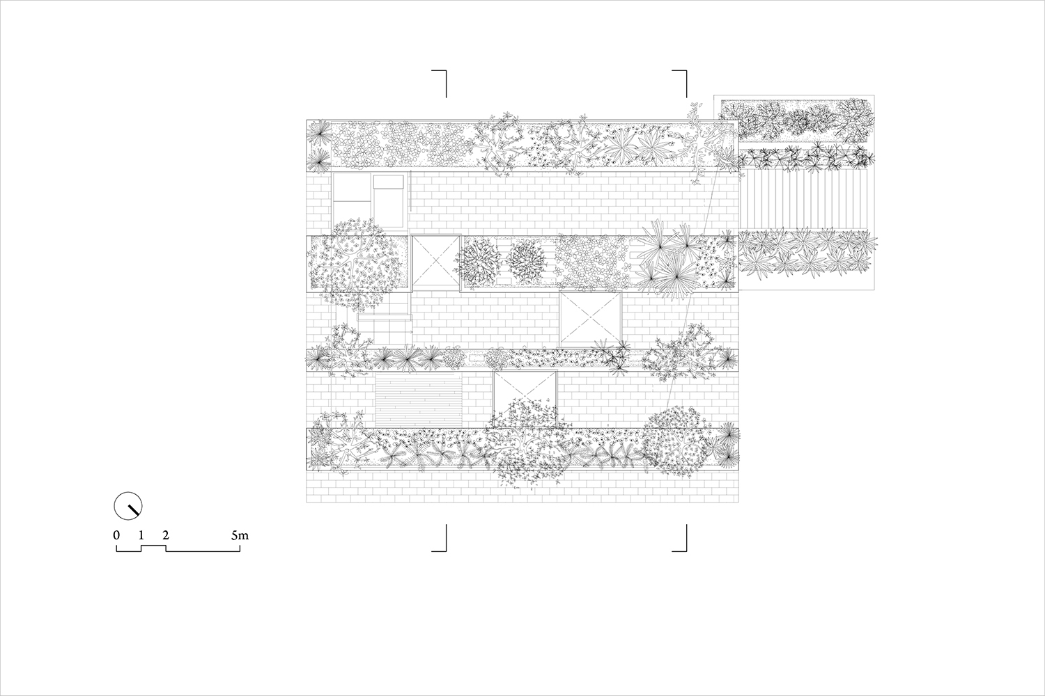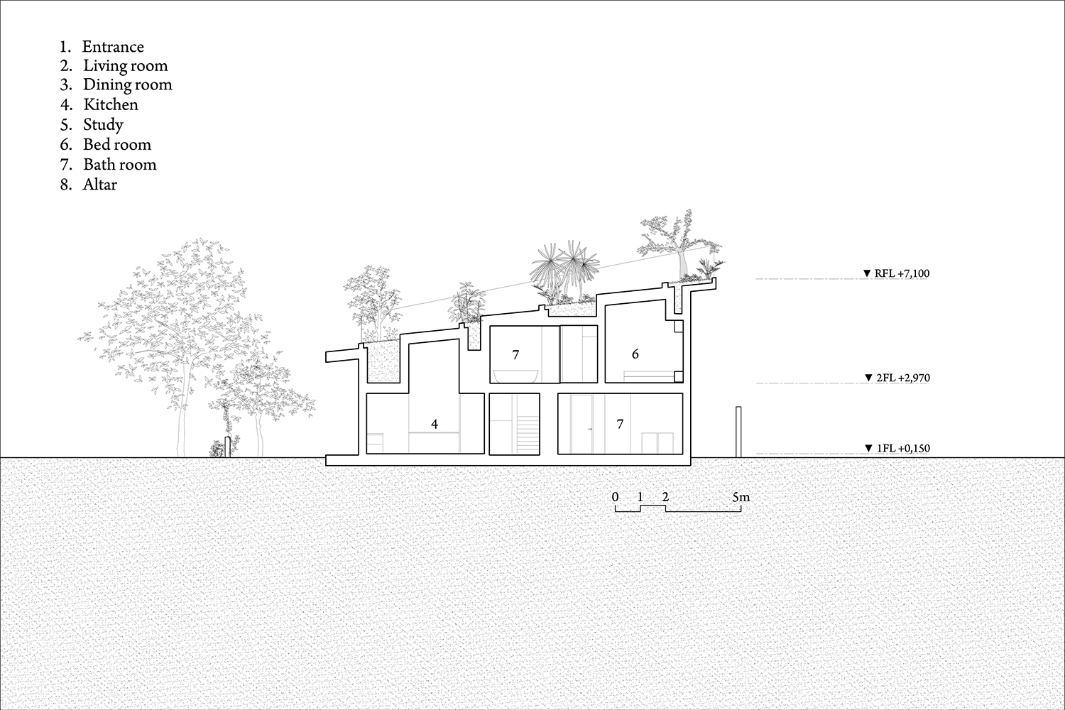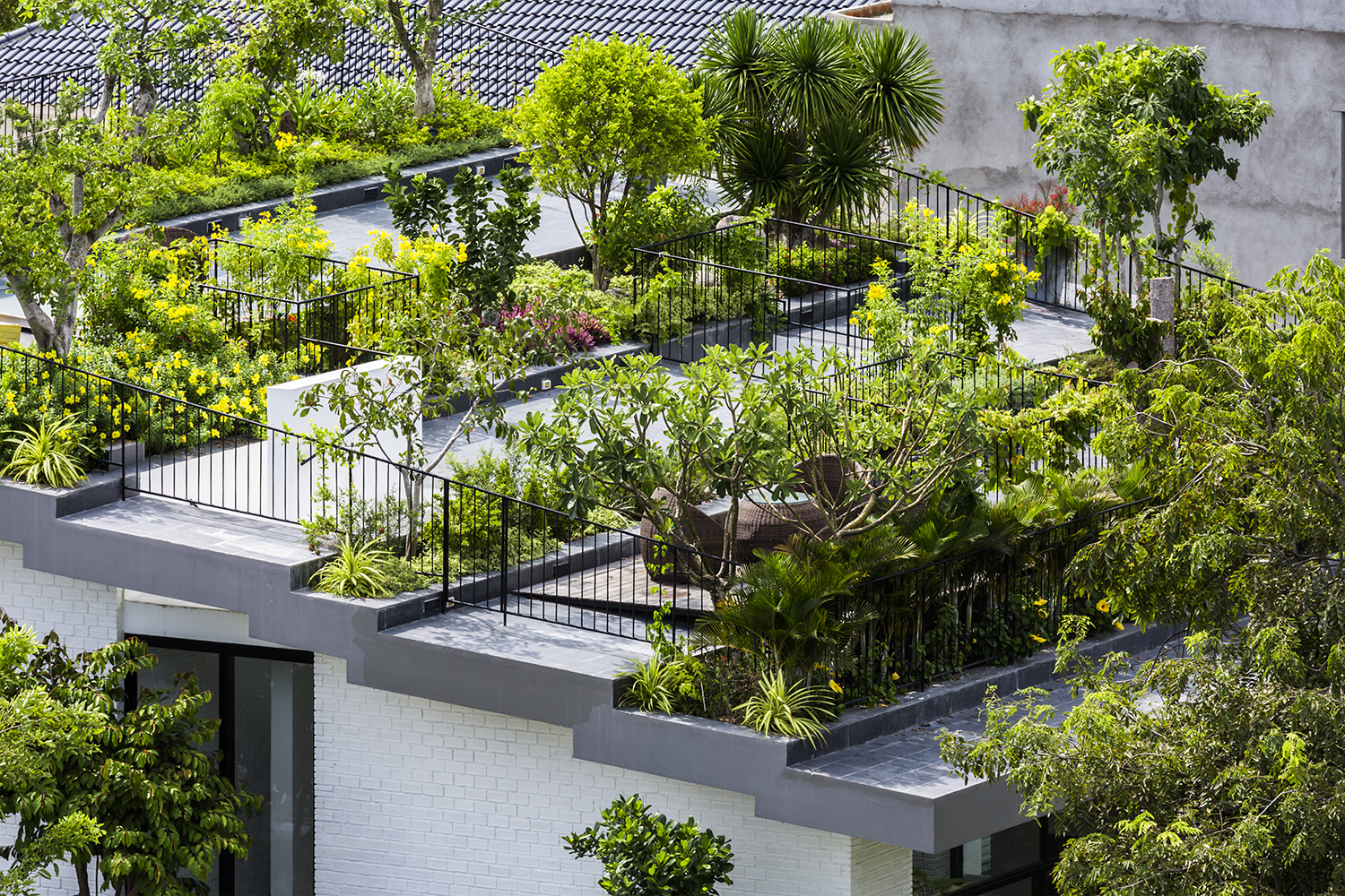 Ngôi nhà là một trong những biến thể của dự án “Nhà Cho Cây” của nhóm KTS Võ Trọng Nghĩa. Có độ dốc nhẹ, cảnh quan trên mái nhà này được kết nối trực quan với những ngọn núi bao quanh. Dưới bóng cây, cư dân có thể ngắm cảnh và trải nghiệm cuộc sống của mình với đầy cây xanh.