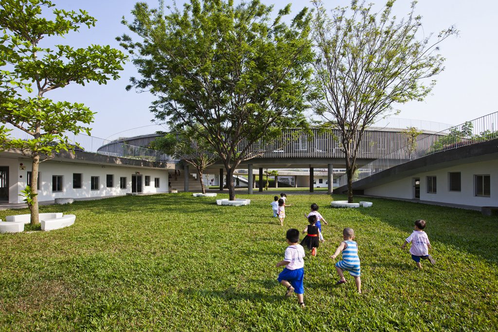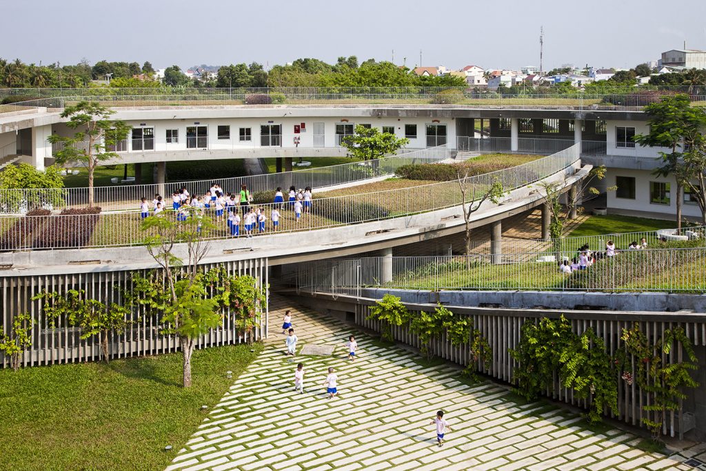 Một ví dụ về công trình Farming Kindergarten – ngôi trường mẫu giáo xanh ở Biên Hòa với sân chơi rộng lớn trải dài liên tục trên mái. Thiết kế tận dụng không gian và tăng cường các hoạt động thể chất gắn liền với thiên nhiên. Mái nhà xanh mát của Farming Kindergarten có hình dạng như ba vòng tròn được vẽ bằng một nét đơn, bao quanh ba khu sân bên trong làm sân chơi an toàn cho trẻ. Một vườn rau thử nghiệm cũng đã được hiện thực hóa trên mái. Có năm loại rau khác nhau được trồng trong khu vườn rộng 200m2 để phục vụ giáo dục nông nghiệp.