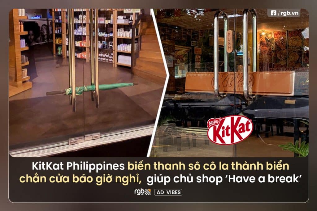 KiKat Philippines vừa ra mắt chiến dịch “KitKat Break Bar”, biến biểu tượng thanh sô cô la và khẩu hiệu “Have A Break” kinh điển của mình thành biển báo giờ đóng cửa cho các cửa hàng. Một chiến dịch sáng tạo kết hợp thương hiệu với văn hoá địa phương.