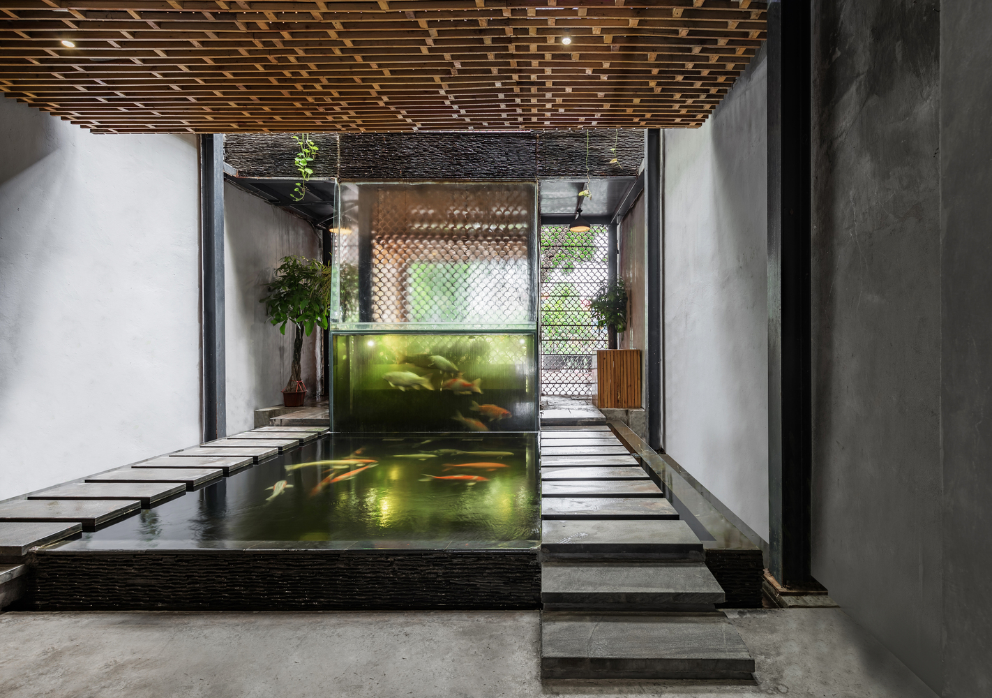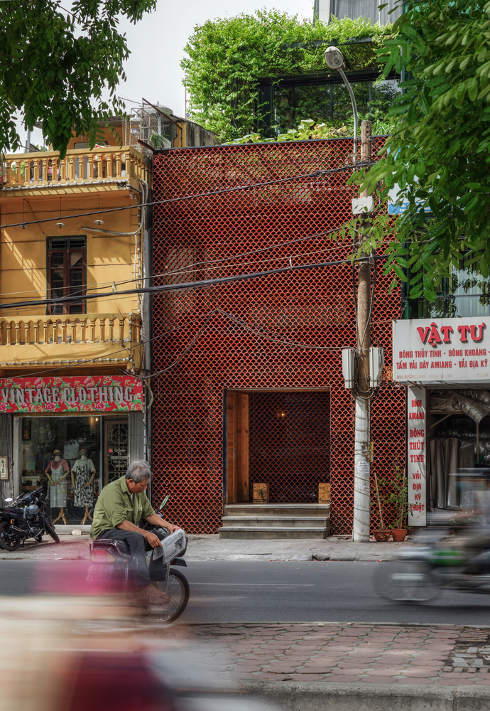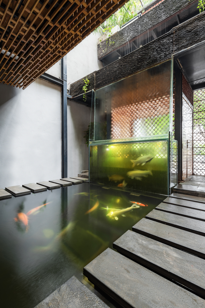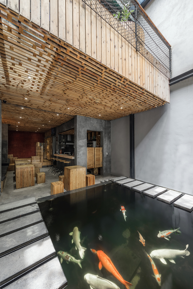 Không gian Koi Cafe tạo ấn tượng mạnh với việc sử dụng ngói Bát Tràng kép truyền thống cho mặt tiền của tòa nhà. Mái nhà như một lớp màng bao phủ toàn bộ mặt tiền, tạo ấn tượng và thu hút sự chú ý bởi sự khác biệt với các công trình xung quanh.
