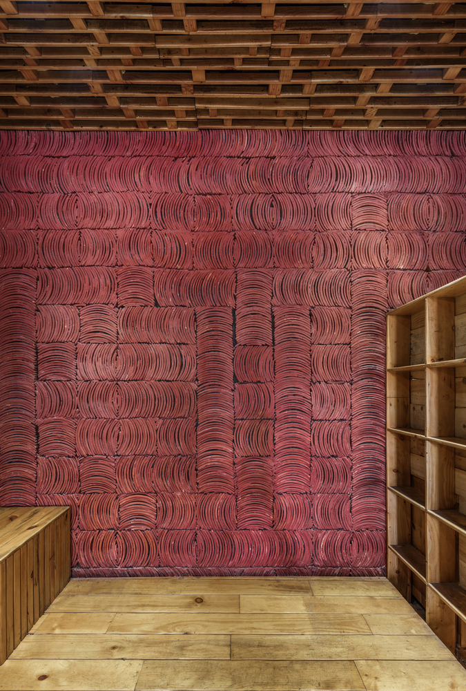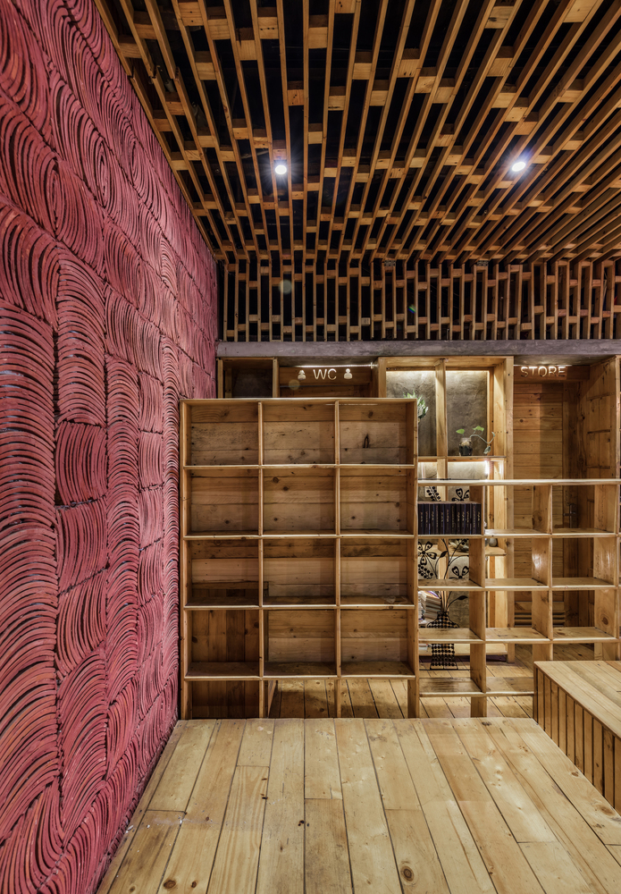 Ngoài ra, toàn bộ nội thất từ trần đến bàn ghế đều được sử dụng lại từ chất liệu gỗ pallet có sẵn của gia chủ.