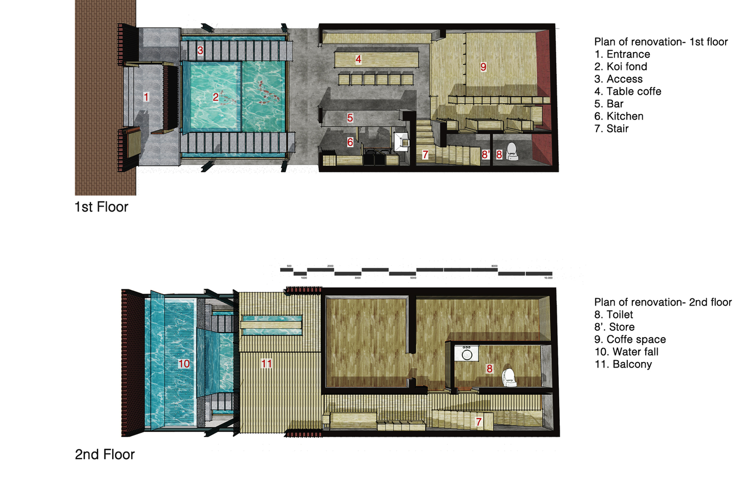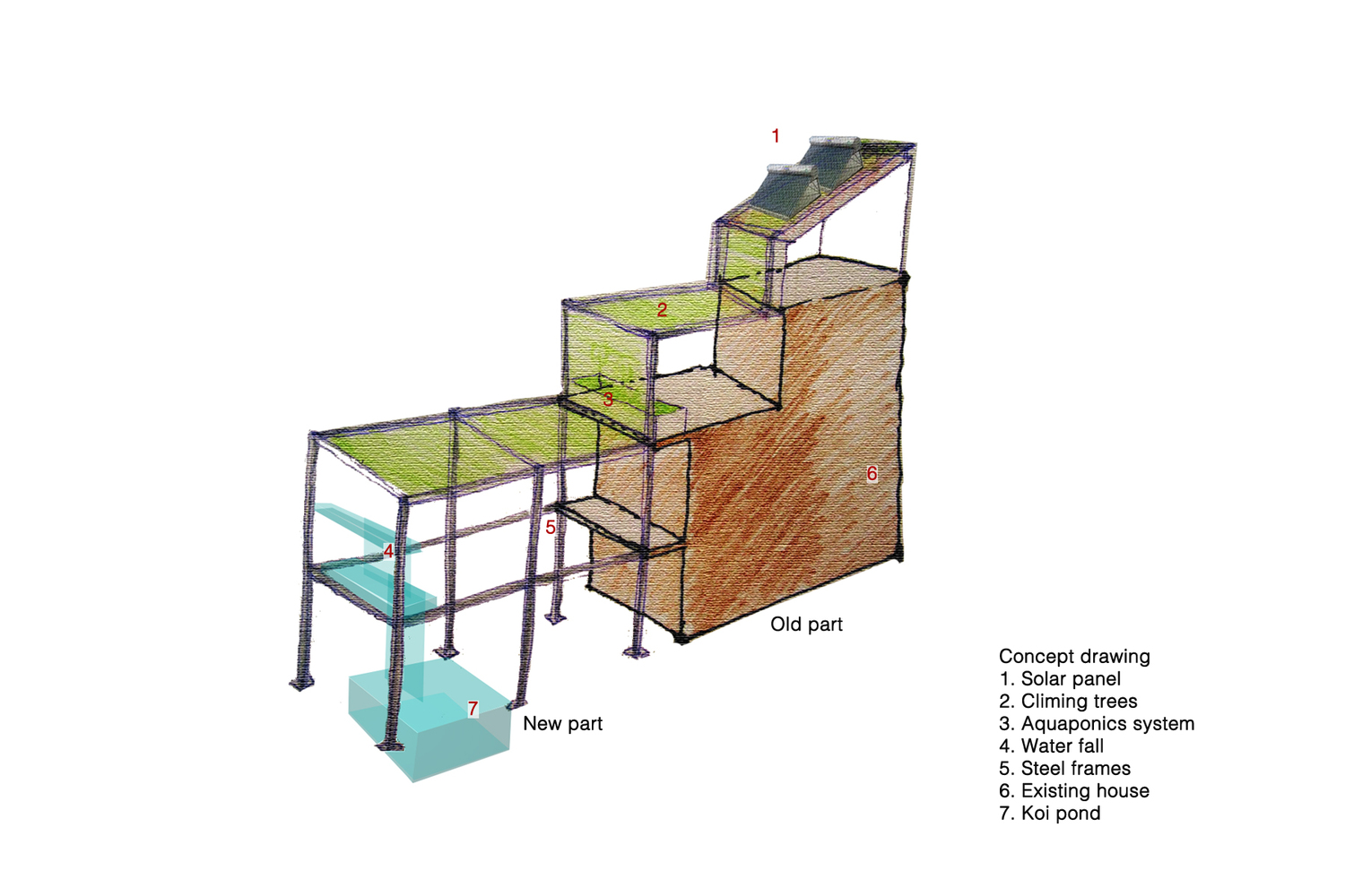 Mục đích của công trình là không gian café kết hợp với hồ cá Koi, một loại cá được mệnh danh là quốc ngư của Nhật Bản. Công trình xây dựng theo kiểu nhà 3 gian có sân trước tổng diện tích 88m2 (5,5m x 16m), yêu cầu thiết kế kết cấu thép dễ lắp đặt, tháo lắp.