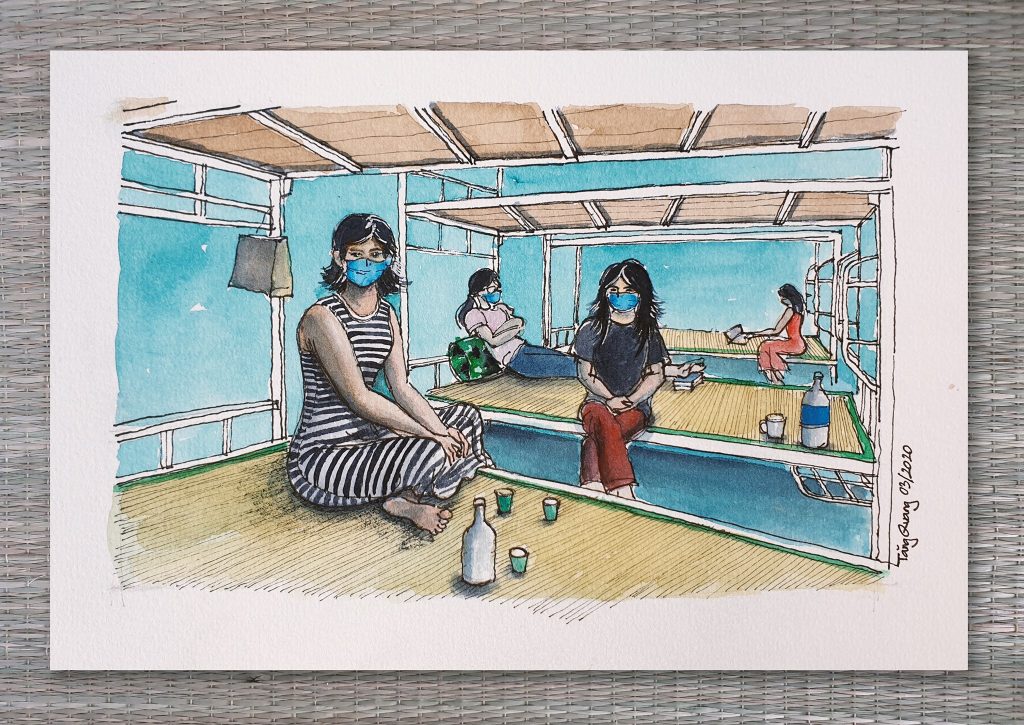 NHỮNG CÂU CHUYỆN HẰNG NGÀY ĐƯỢC TĂNG QUANG TƯỜNG THUẬT Ảnh 2: Giờ cơm trưa. Đến giờ cơm trưa lại phải bê thêm 1 đợt hàng nữa, sau đó mang đến từng phòng, từ tốn chờ đợi mọi người lựa chọn. Ai có nhu cầu ăn chay, hay dị ứng, các bạn đều ghi lại, và chăm sóc tận tình. Những ngày mà đồ ăn không đủ, các bạn còn hy sinh cả phần ăn của mình, nhường cho mọi người trong khu cách ly, sợ các bạn không có đồ ăn không có sức đề kháng phòng bệnh. Ảnh 3: Sau khi phát đồ ăn cho từng phòng, các bạn lại cặm cụi thu dọn. Công việc vất vả, trời Sài Gòn oi và nóng, nhưng chưa bao giờ mọi người thấy các bạn than phiền. Thậm chí, các bạn còn phát cho từng phòng số điện thoại cá nhân để gọi khi cần trợ giúp. Ai trong khu cách ly cũng yêu quý các bạn. Ảnh 4: Mấy bạn còn rất tình cảm. Gần đến ngày chia tay, các bạn đi từng phòng phát quà, nói lời cảm ơn. Hôm qua mỗi phòng được nhận 2 hộp chocolate. Hôm nay mỗi bạn được tặng 1 móc khoá hand-made theo con giáp. Mình đã rất bất ngờ, khi mấy bạn nhớ tuổi của mình và chọn sẵn cho mình con giáp tương ứng. Mỗi bạn trong khu cách ly đều có nhiểu cách khác nhau để thay lời cảm ơn đến các chiến sĩ. Một nửa album này là serie mình vẽ tặng các bạn. Xem chi tiết nội dung mỗi ảnh ký họa tại Facebook Tăng Quang