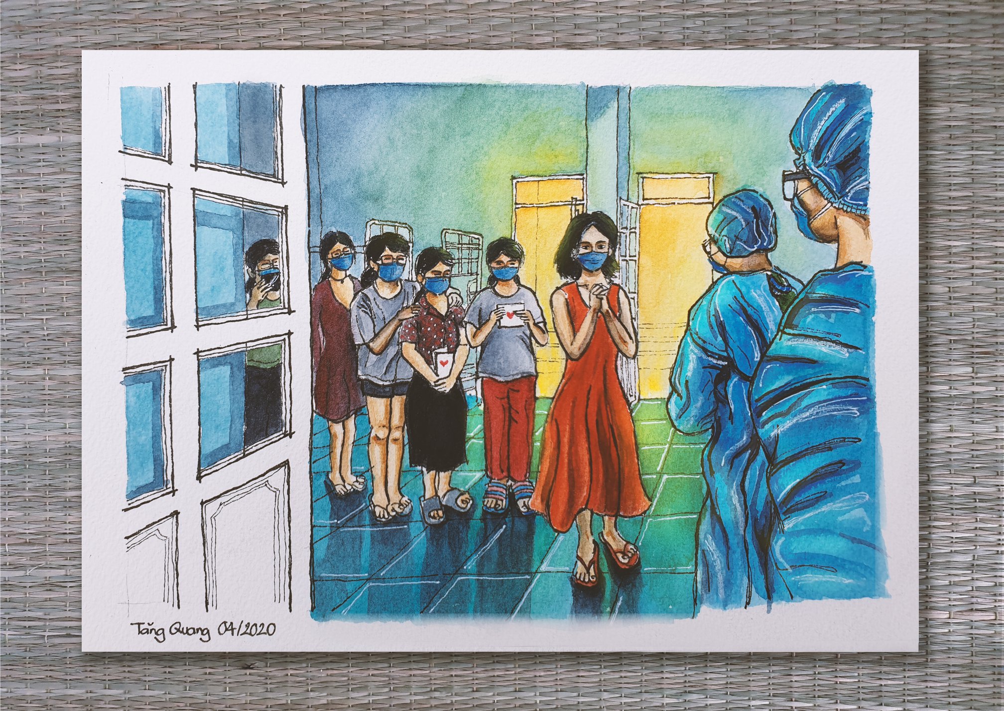 Những bức ký họa dễ thương cùng nội dung hài hước duyên dáng của chàng kiến trúc sư Tăng Quang, mô tả cuộc sống những ngày trong khu cách ly khiến dân tình thích thú. Bộ ảnh “gây bão” với hàng chục ngàn lượt tương tác này đã một phần cho người xem hình dung được sự vất vả và nỗ lực của các chiến sĩ chống dịch.