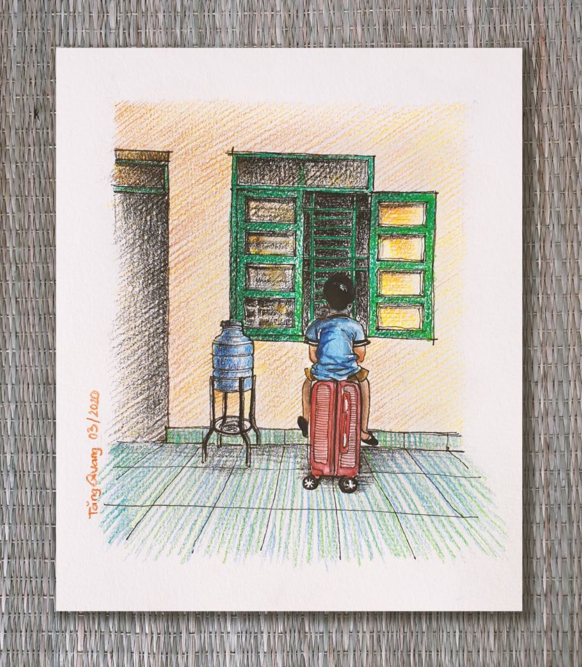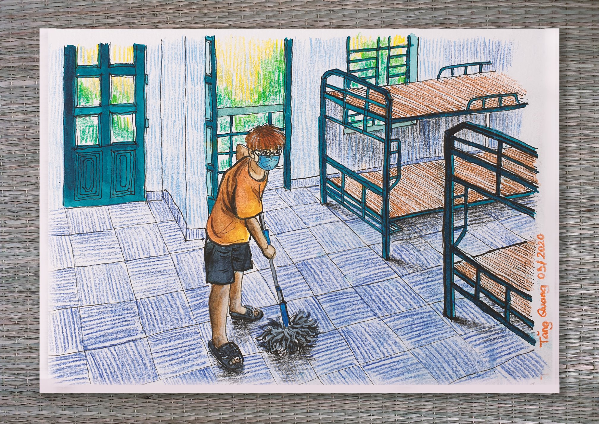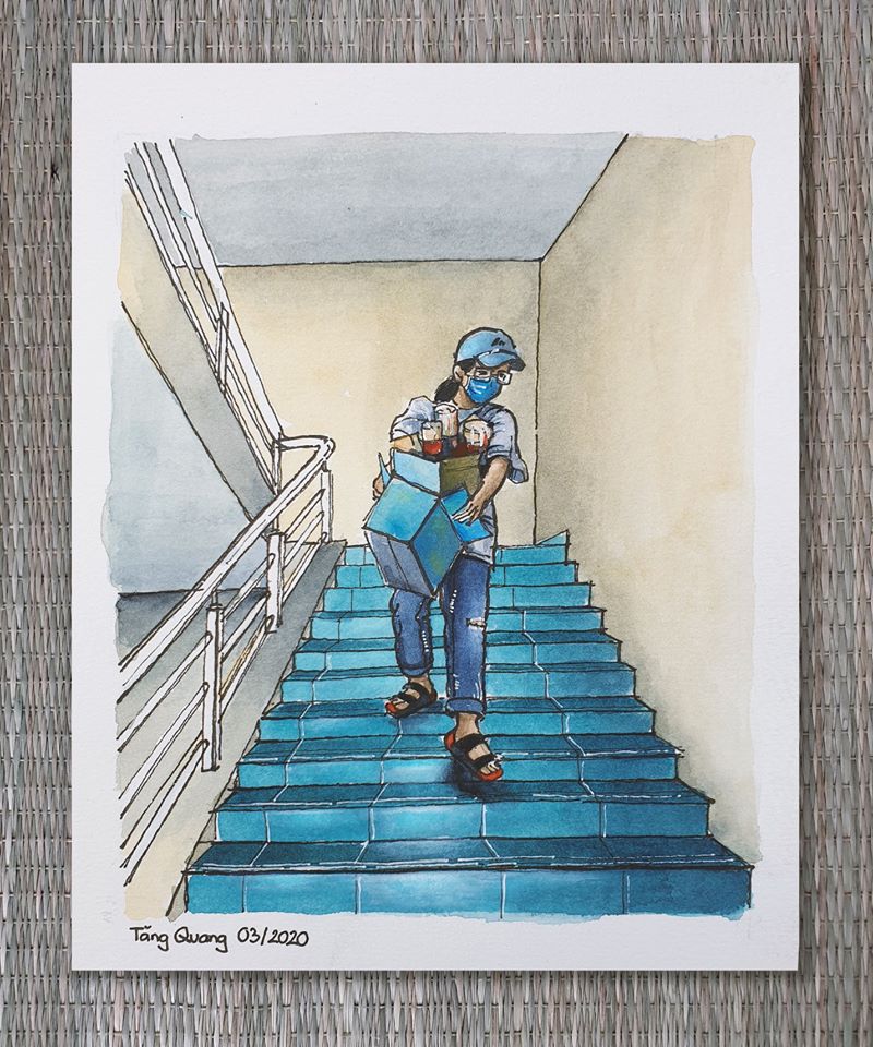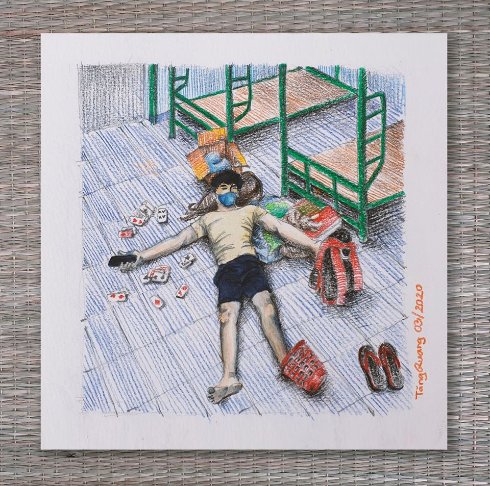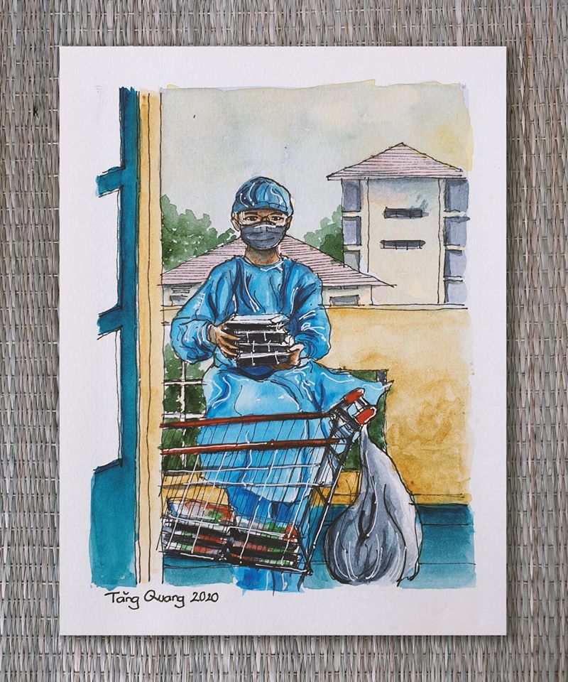 NHỮNG CÂU CHUYỆN HẰNG NGÀY ĐƯỢC TĂNG QUANG TƯỜNG THUẬT Ảnh 2: Giờ cơm trưa. Đến giờ cơm trưa lại phải bê thêm 1 đợt hàng nữa, sau đó mang đến từng phòng, từ tốn chờ đợi mọi người lựa chọn. Ai có nhu cầu ăn chay, hay dị ứng, các bạn đều ghi lại, và chăm sóc tận tình. Những ngày mà đồ ăn không đủ, các bạn còn hy sinh cả phần ăn của mình, nhường cho mọi người trong khu cách ly, sợ các bạn không có đồ ăn không có sức đề kháng phòng bệnh. Ảnh 3: Sau khi phát đồ ăn cho từng phòng, các bạn lại cặm cụi thu dọn. Công việc vất vả, trời Sài Gòn oi và nóng, nhưng chưa bao giờ mọi người thấy các bạn than phiền. Thậm chí, các bạn còn phát cho từng phòng số điện thoại cá nhân để gọi khi cần trợ giúp. Ai trong khu cách ly cũng yêu quý các bạn. Ảnh 4: Mấy bạn còn rất tình cảm. Gần đến ngày chia tay, các bạn đi từng phòng phát quà, nói lời cảm ơn. Hôm qua mỗi phòng được nhận 2 hộp chocolate. Hôm nay mỗi bạn được tặng 1 móc khoá hand-made theo con giáp. Mình đã rất bất ngờ, khi mấy bạn nhớ tuổi của mình và chọn sẵn cho mình con giáp tương ứng. Mỗi bạn trong khu cách ly đều có nhiểu cách khác nhau để thay lời cảm ơn đến các chiến sĩ. Một nửa album này là serie mình vẽ tặng các bạn. Xem chi tiết nội dung mỗi ảnh ký họa tại Facebook Tăng Quang