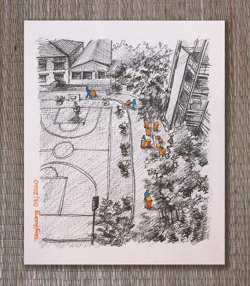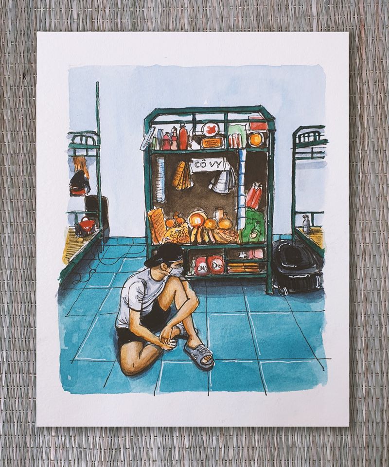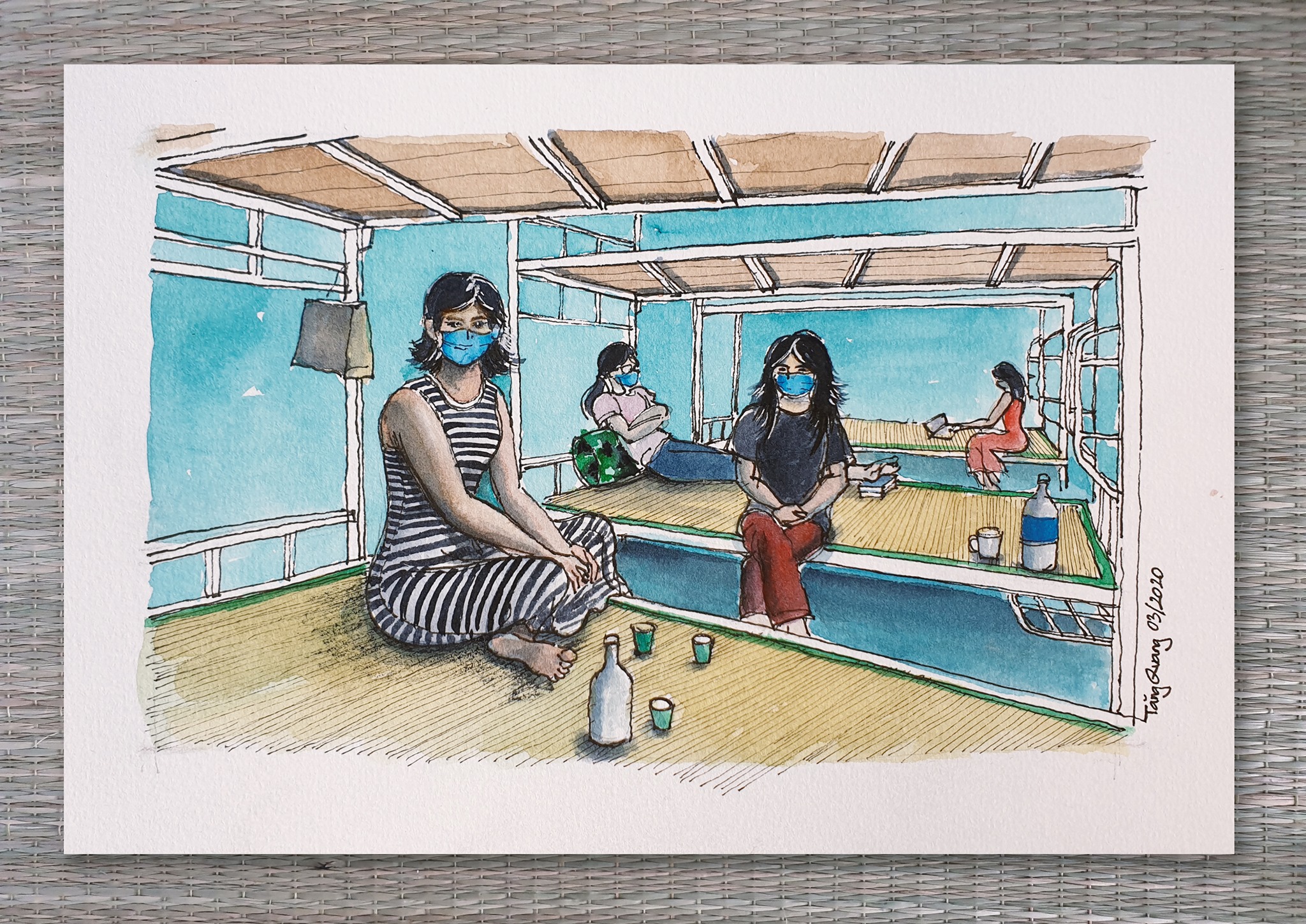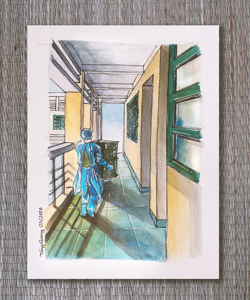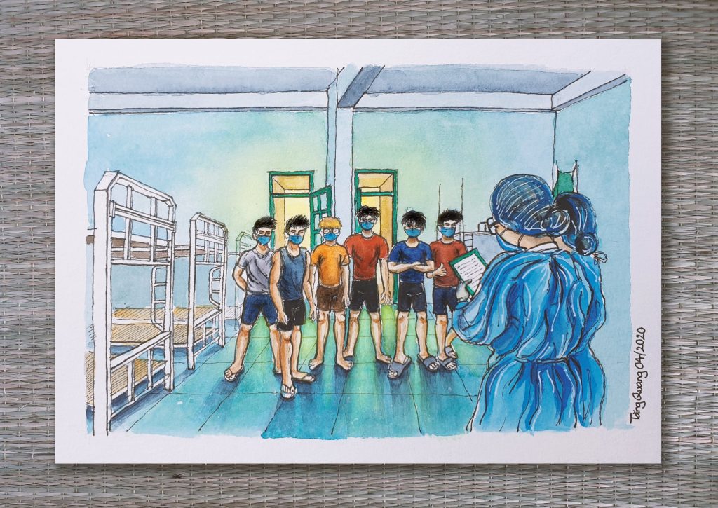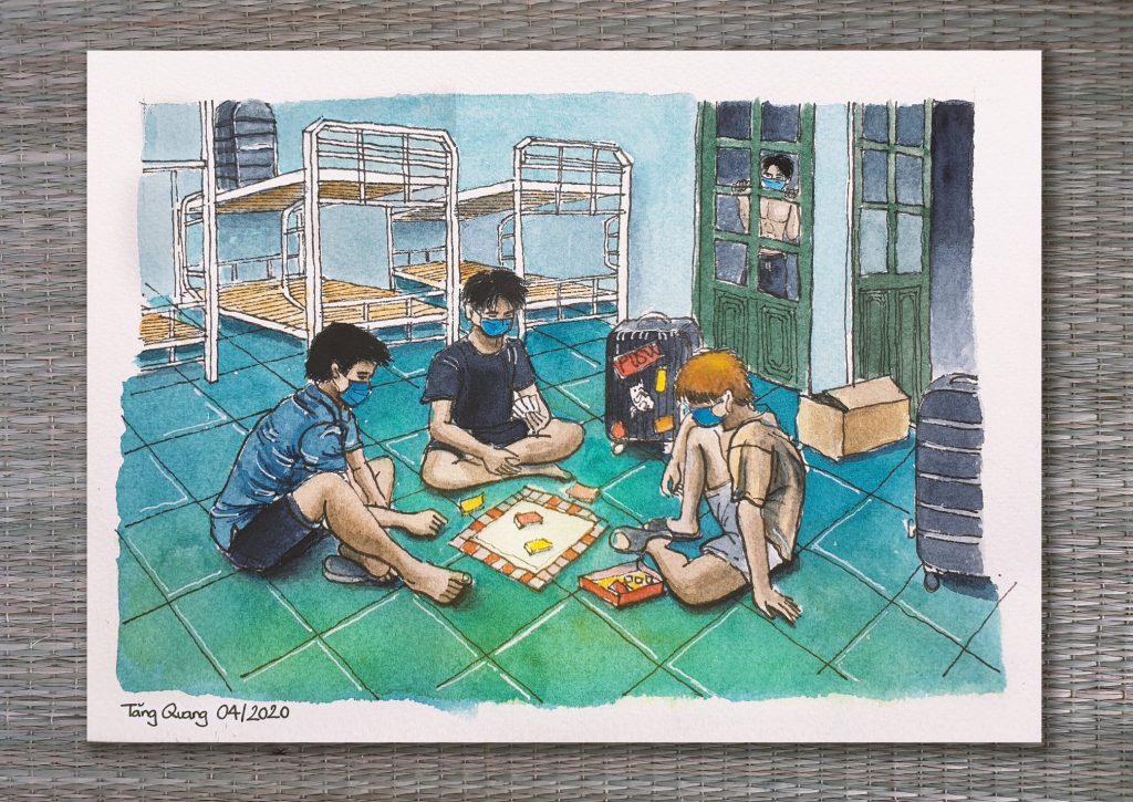 NHỮNG CÂU CHUYỆN HẰNG NGÀY ĐƯỢC TĂNG QUANG TƯỜNG THUẬT Ảnh 2: Giờ cơm trưa. Đến giờ cơm trưa lại phải bê thêm 1 đợt hàng nữa, sau đó mang đến từng phòng, từ tốn chờ đợi mọi người lựa chọn. Ai có nhu cầu ăn chay, hay dị ứng, các bạn đều ghi lại, và chăm sóc tận tình. Những ngày mà đồ ăn không đủ, các bạn còn hy sinh cả phần ăn của mình, nhường cho mọi người trong khu cách ly, sợ các bạn không có đồ ăn không có sức đề kháng phòng bệnh. Ảnh 3: Sau khi phát đồ ăn cho từng phòng, các bạn lại cặm cụi thu dọn. Công việc vất vả, trời Sài Gòn oi và nóng, nhưng chưa bao giờ mọi người thấy các bạn than phiền. Thậm chí, các bạn còn phát cho từng phòng số điện thoại cá nhân để gọi khi cần trợ giúp. Ai trong khu cách ly cũng yêu quý các bạn. Ảnh 4: Mấy bạn còn rất tình cảm. Gần đến ngày chia tay, các bạn đi từng phòng phát quà, nói lời cảm ơn. Hôm qua mỗi phòng được nhận 2 hộp chocolate. Hôm nay mỗi bạn được tặng 1 móc khoá hand-made theo con giáp. Mình đã rất bất ngờ, khi mấy bạn nhớ tuổi của mình và chọn sẵn cho mình con giáp tương ứng. Mỗi bạn trong khu cách ly đều có nhiểu cách khác nhau để thay lời cảm ơn đến các chiến sĩ. Một nửa album này là serie mình vẽ tặng các bạn. Xem chi tiết nội dung mỗi ảnh ký họa tại Facebook Tăng Quang