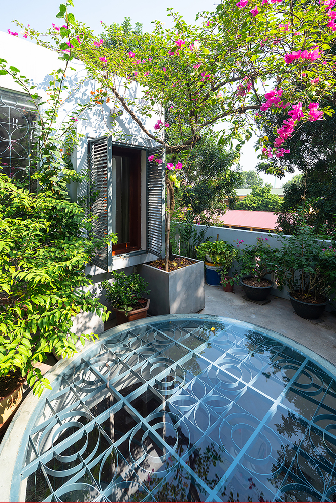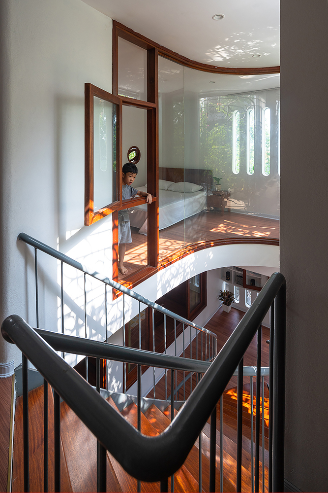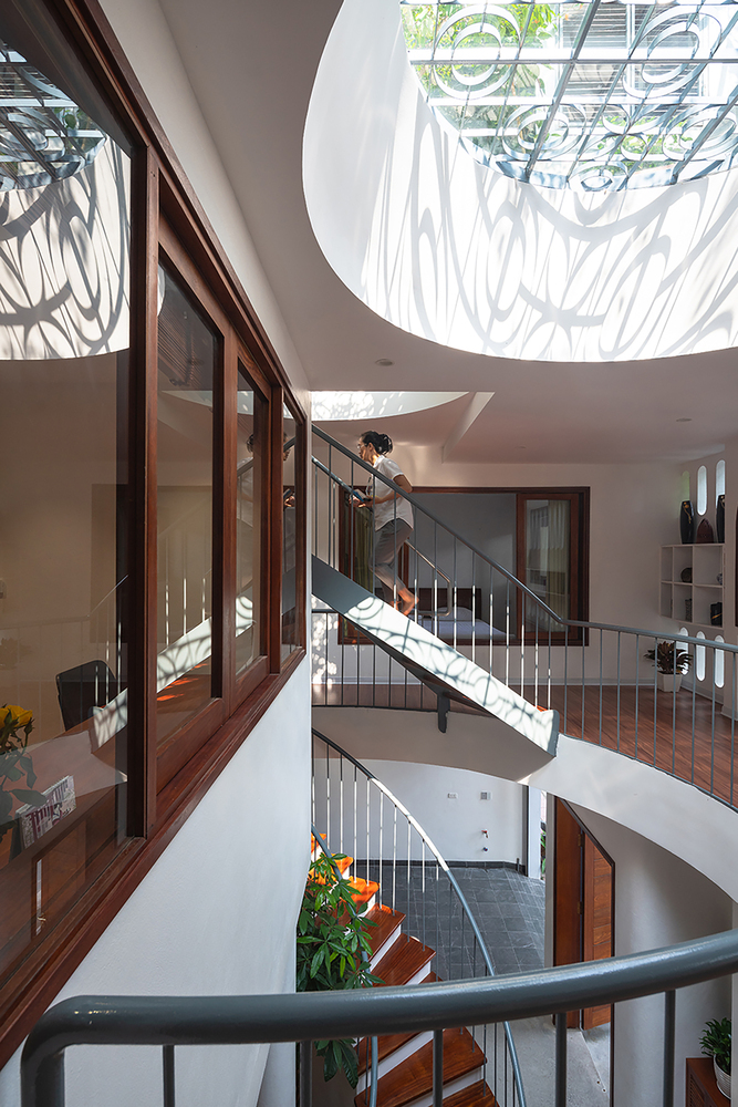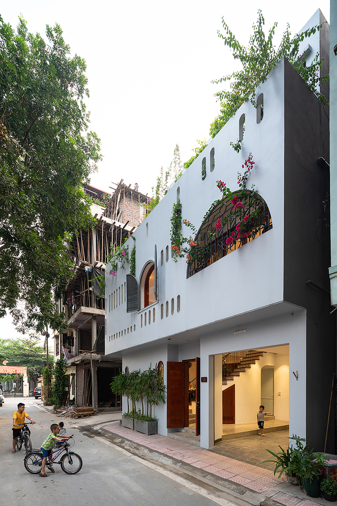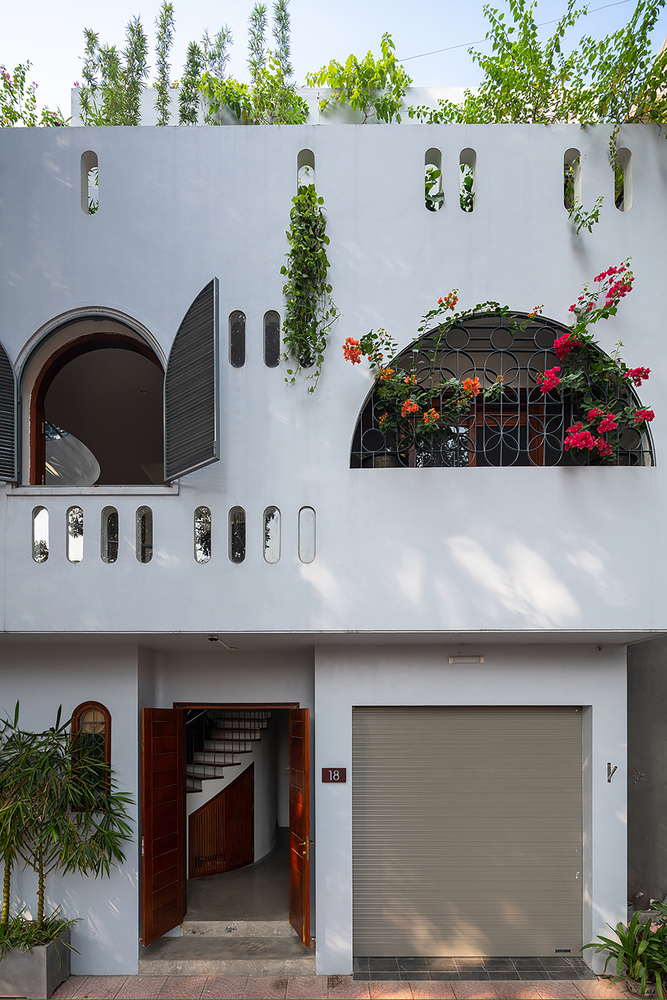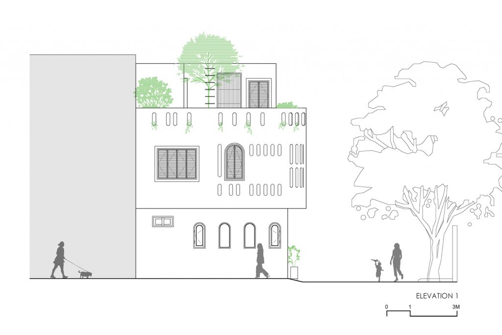 Phòng ngủ tại 2F và 3F được thiết kế mở ra ban công xanh mát và sân vườn trên sân thượng nên luôn đón được luồng không khí trong lành. Khu vườn trên mái – nơi mà chủ nhân thích chăm sóc – giúp bảo vệ ngôi nhà khỏi ánh nắng nóng trực tiếp. Mặt tiền được thiết kế với nhiều lỗ hình ô van vừa lấy sáng tự nhiên vừa đảm bảo an ninh cho ngôi nhà. Ánh sáng từ ngôi nhà vào buổi tối dù là những lỗ hổng và cây xanh hắt ra từ ban công và sân vườn trên sân thượng làm cho góc phố trở nên ấm cúng và sinh động.