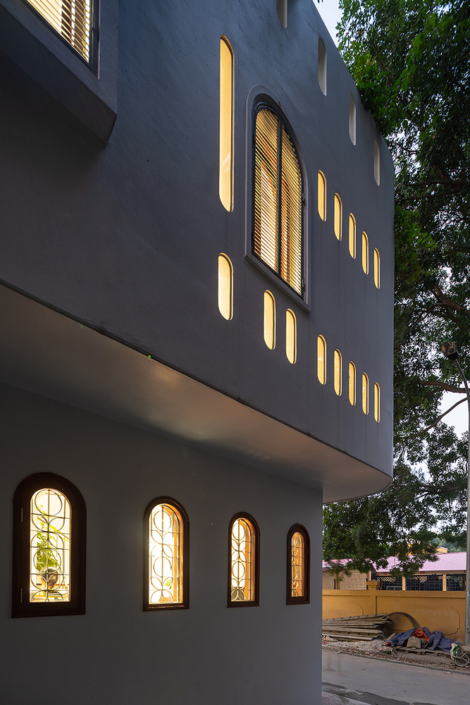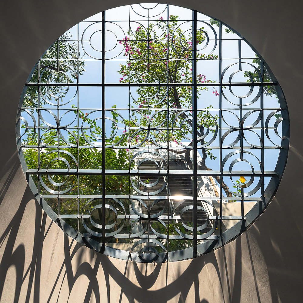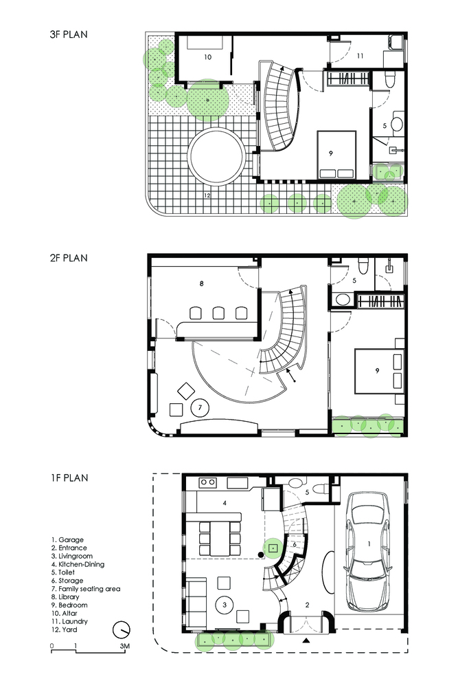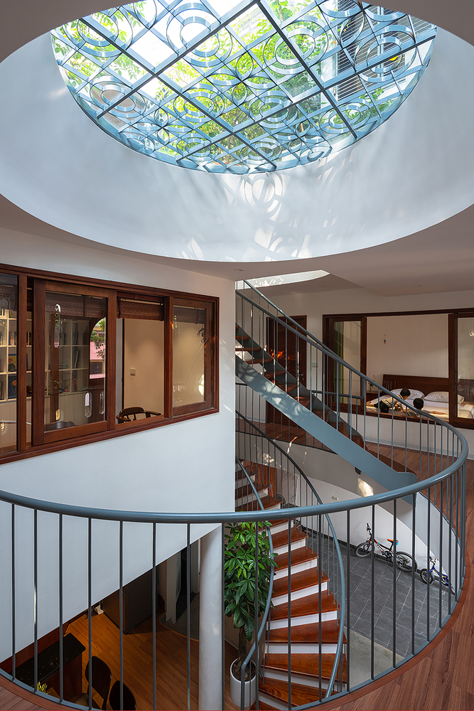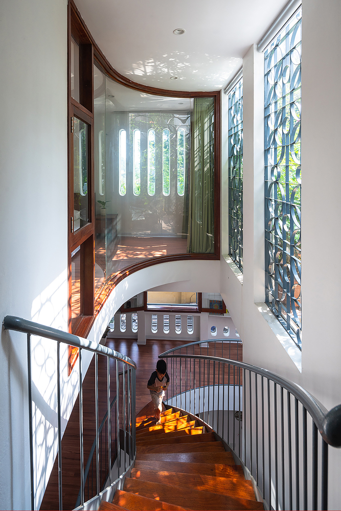 Phòng ngủ tại 2F và 3F được thiết kế mở ra ban công xanh mát và sân vườn trên sân thượng nên luôn đón được luồng không khí trong lành. Khu vườn trên mái – nơi mà chủ nhân thích chăm sóc – giúp bảo vệ ngôi nhà khỏi ánh nắng nóng trực tiếp. Mặt tiền được thiết kế với nhiều lỗ hình ô van vừa lấy sáng tự nhiên vừa đảm bảo an ninh cho ngôi nhà. Ánh sáng từ ngôi nhà vào buổi tối dù là những lỗ hổng và cây xanh hắt ra từ ban công và sân vườn trên sân thượng làm cho góc phố trở nên ấm cúng và sinh động.