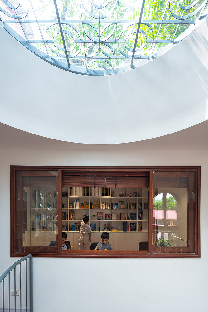 Ý tưởng chính của dự án này là tạo ra một không gian chung giống như một thư viện, tràn ngập ánh sáng tự nhiên và cây xanh trong nhà, nơi mọi người có thể làm việc và học tập cùng nhau và gợi mở nhiều hoạt động tương tác. Ngôi nhà nằm ở một góc phố thuộc quận Long Biên, Hà Nội. Chủ nhân là gia đình vợ chồng trẻ với 2 con nhỏ.
