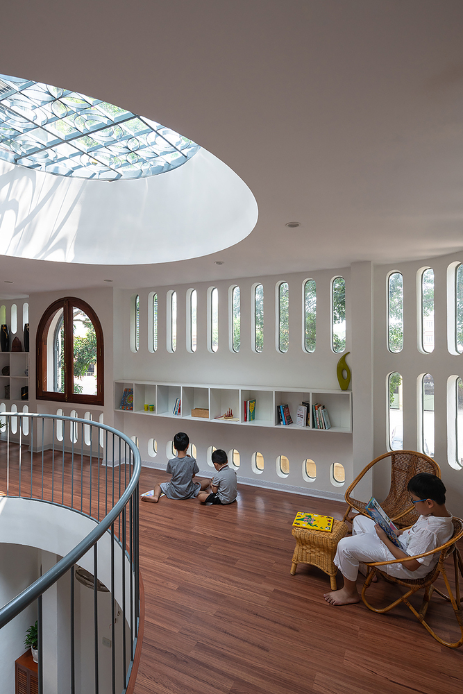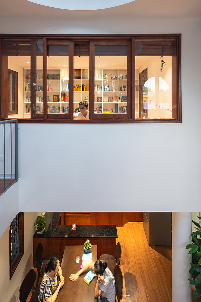 Tủ sách và nội thất được bố trí cùng với sự lưu thông này nên nó có chức năng như một thư viện nhỏ trong nhà và mọi người có thể lựa chọn nơi làm việc, học tập hay đọc cuốn sách yêu thích. Bằng cách lắp đặt một khoảng trống ở tầng hai và một đèn tròn phía trên, không gian trở nên tràn ngập ánh sáng tự nhiên và cây xanh xung quanh. Khoảng trống này kết nối qua 3 tầng, khơi gợi sự giao tiếp tương tác bên trong ngôi nhà. Phòng ăn-khách được đặt ở tầng một. Ánh sáng tự nhiên có thể chiếu từ đèn trên xuống tầng 1 qua khoảng trống.