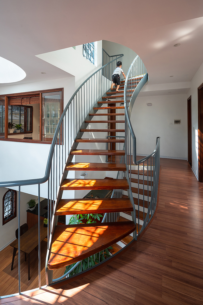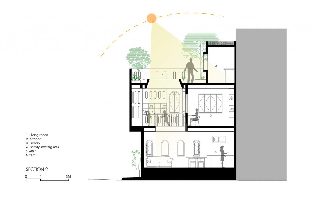 Mô hình gia đình hạt nhân rất phổ biến trong xã hội Việt Nam hiện nay. Họ cần không gian để có thể làm việc tại nhà trong khi chăm sóc con cái. Điều này khuyến khích KTS đề xuất ý tưởng để đáp ứng lối sống như vậy ngày nay. Ngôi nhà có 3 tầng và không gian chung được bố trí ở tầng 2. Cửa thông phòng và hành lang tầng 2 được thiết kế mở liền nhau tạo sự lưu thông chuyển động trên tầng này nên mọi người dễ dàng di chuyển qua lại.